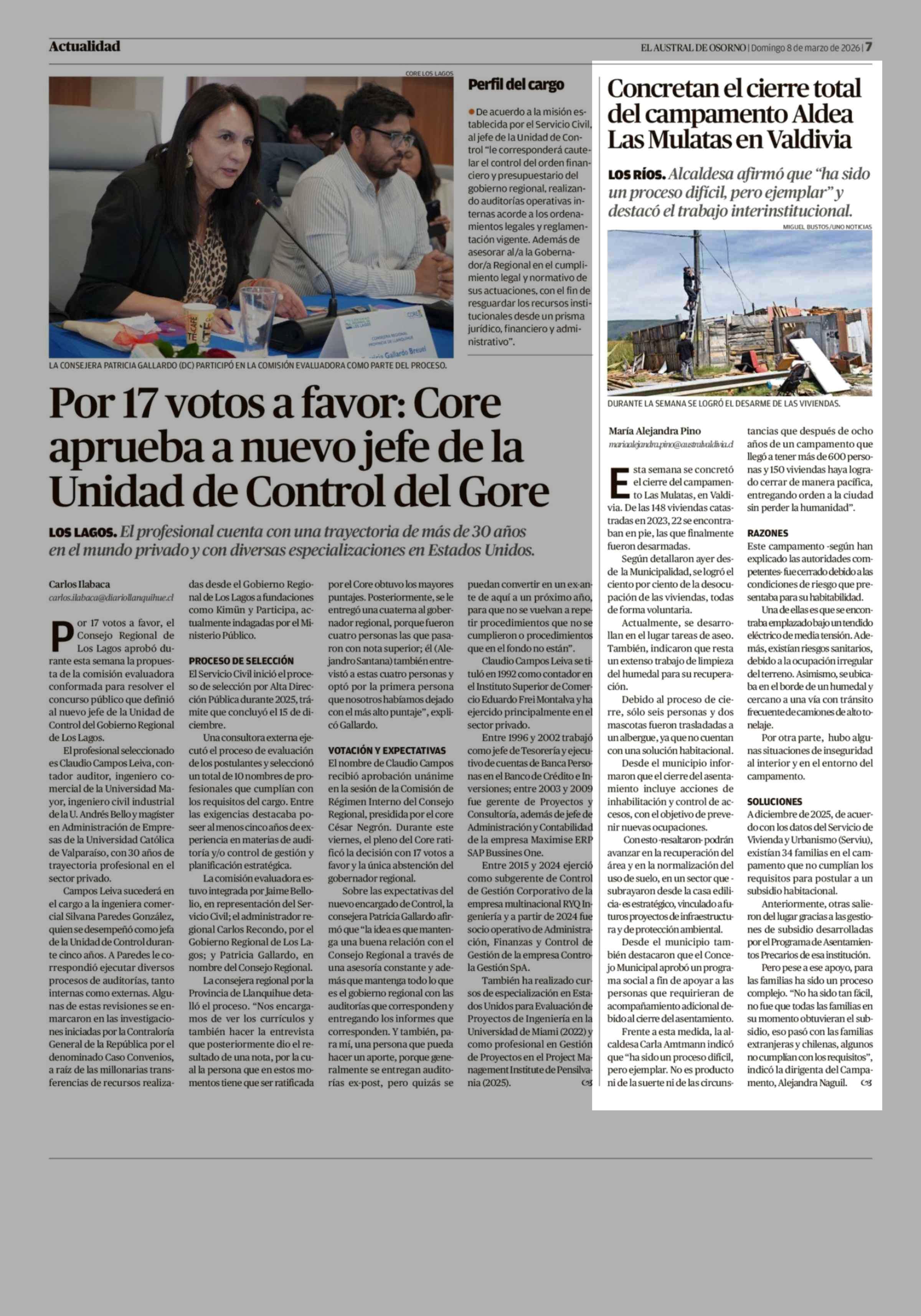 Concretan el cierre total del campamento Aldea Las Mulatas en Valdivia 08-03-2026 El Austral de Osorno |