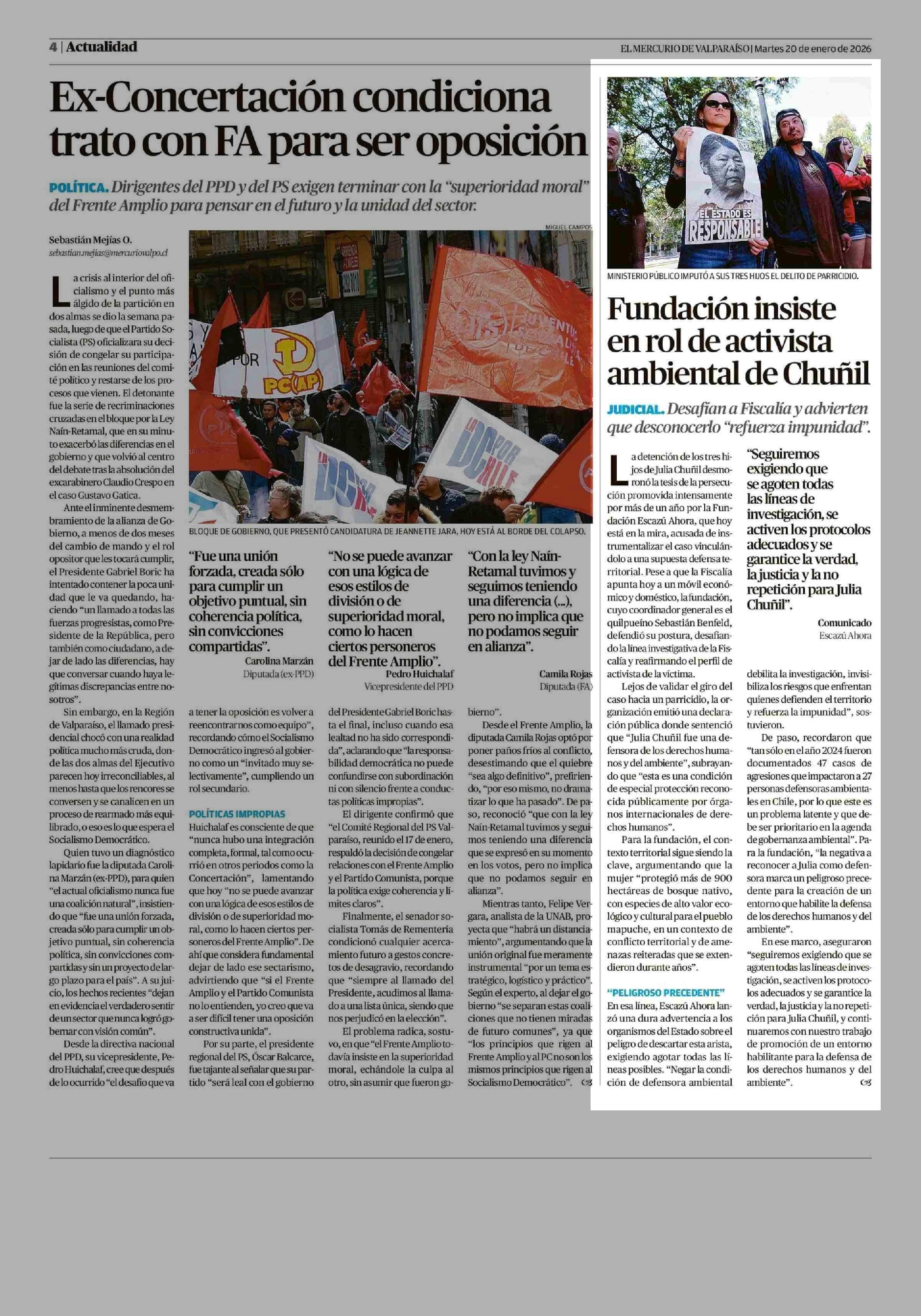 Fundación insiste en rol de activista ambiental de Chuñil 20-01-2026 El Mercurio de Valparaíso |