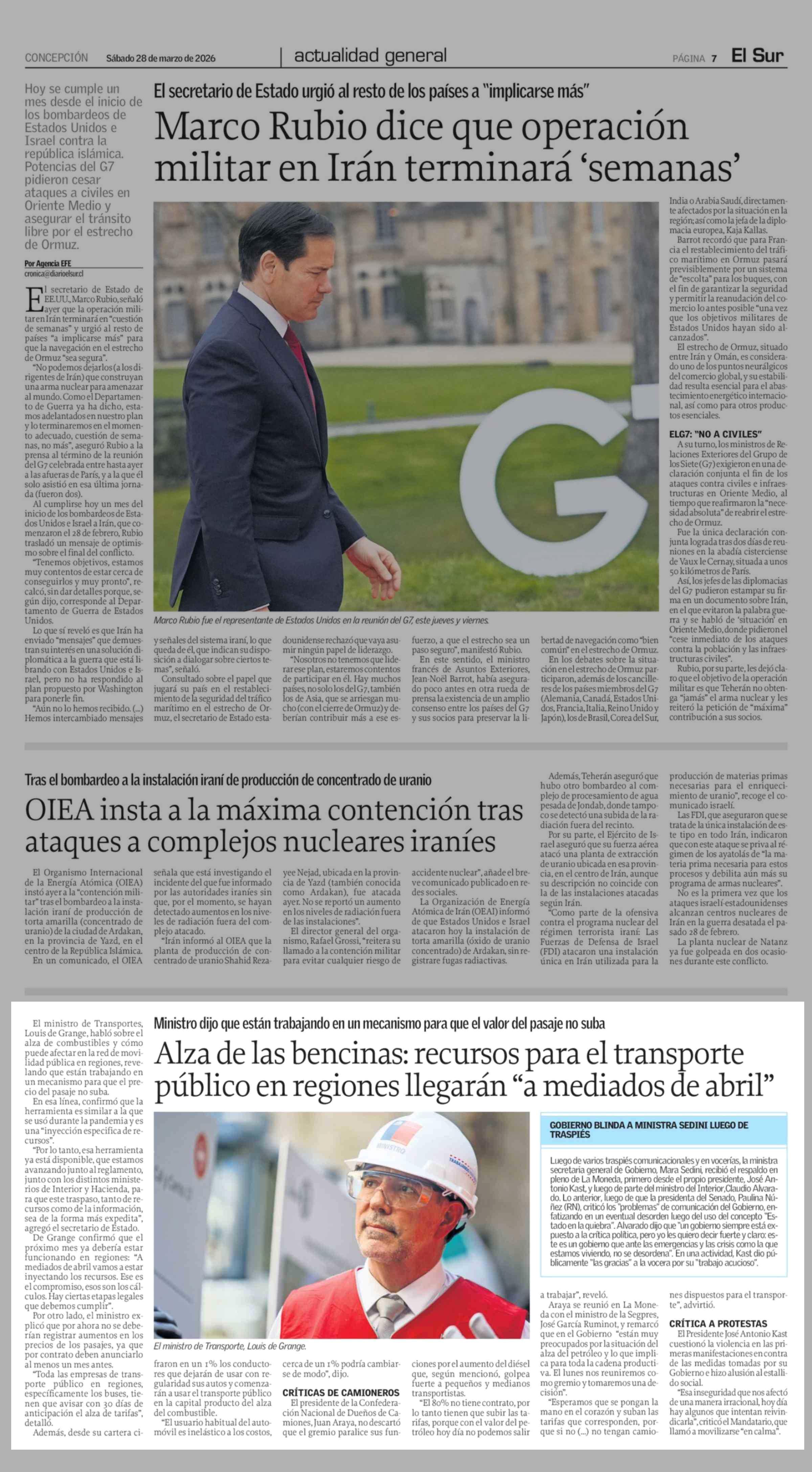 Alza de las bencinas: recursos para el transporte público en regiones llegarán "a mediados de abril" 28-03-2026 El Sur |
