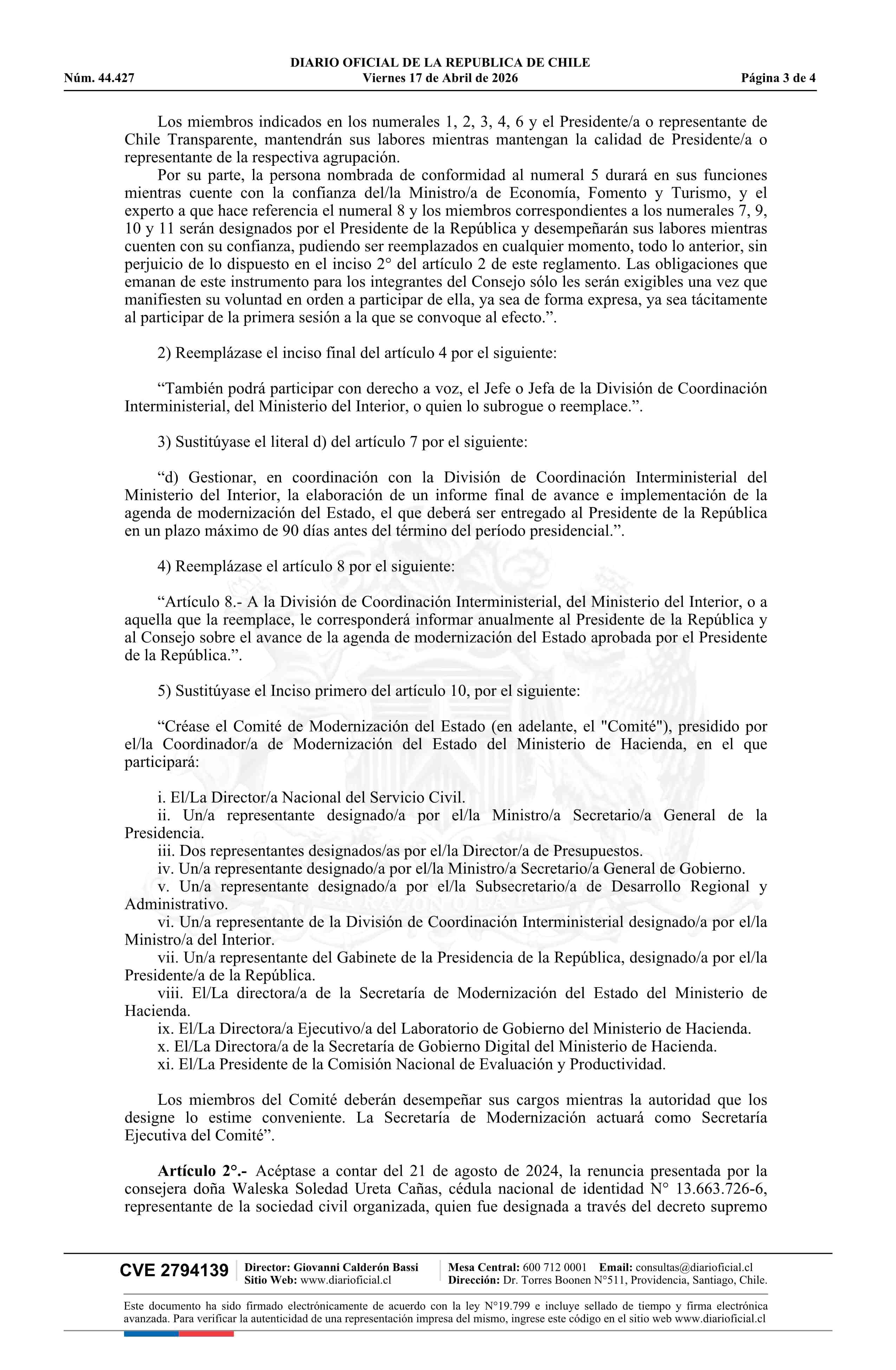 Título: Decreto número 13, de 2026.- Modifica decreto N° 12, de 2018, del Ministerio Secretaría General de la Presidencia, en el sentido que señala, y renueva y designa miembros que indica del Consejo Asesor Permanente para la Modernización del Estado
