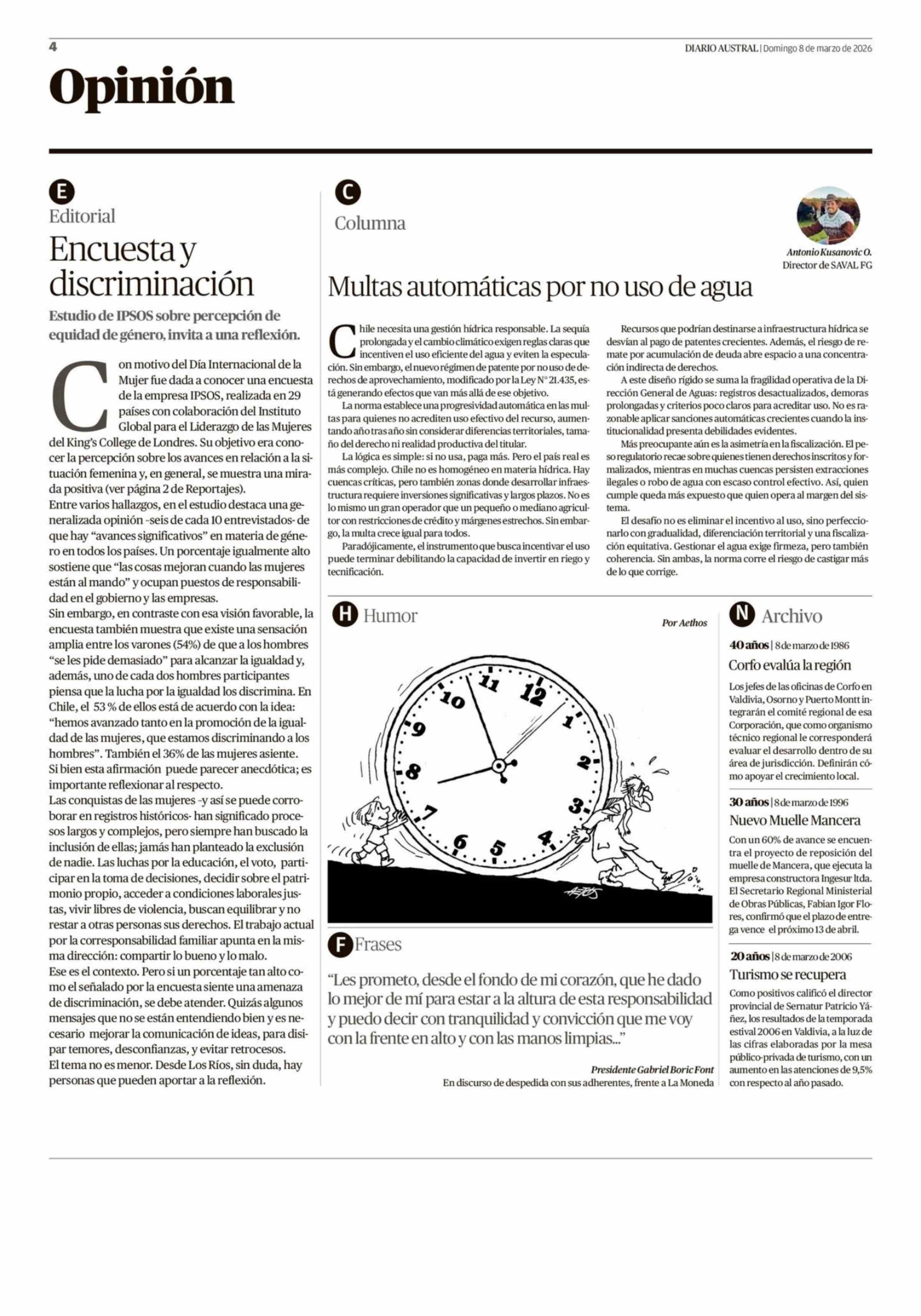 Multas automáticas por no uso de agua 08-03-2026 Diario Austral Región de Los Ríos |