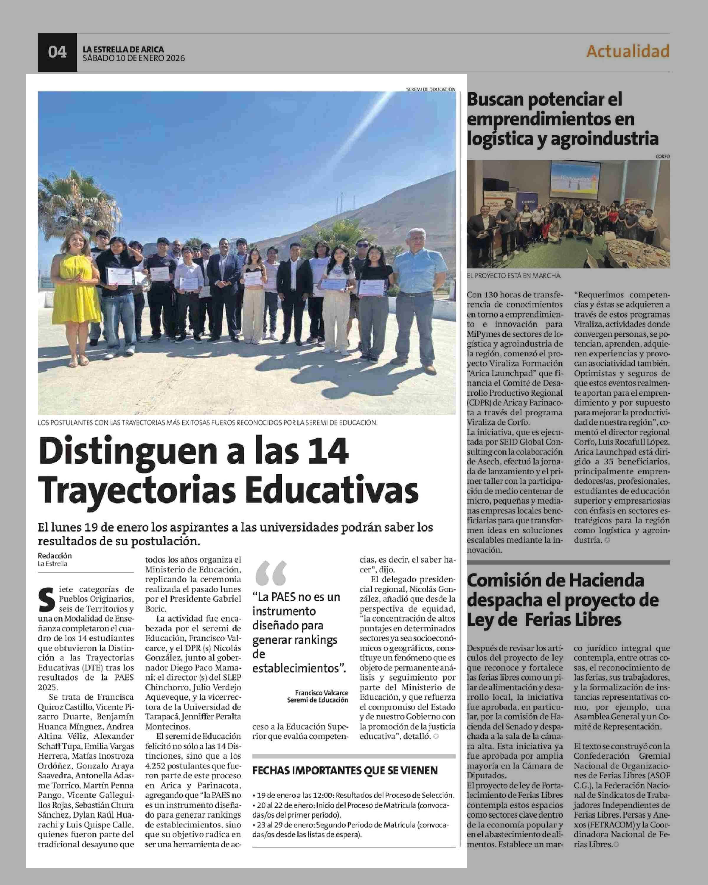 Distinguen a las 14 Trayectorias Educativas 10-01-2026 La Estrella de Arica |