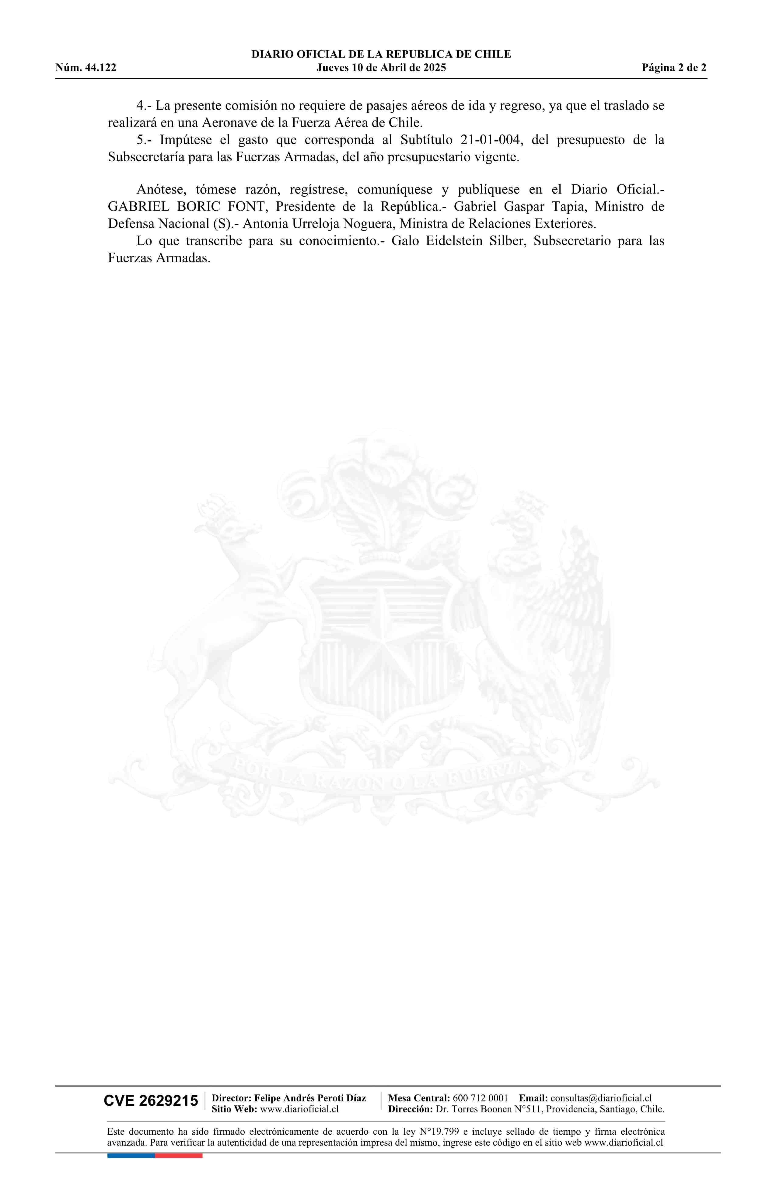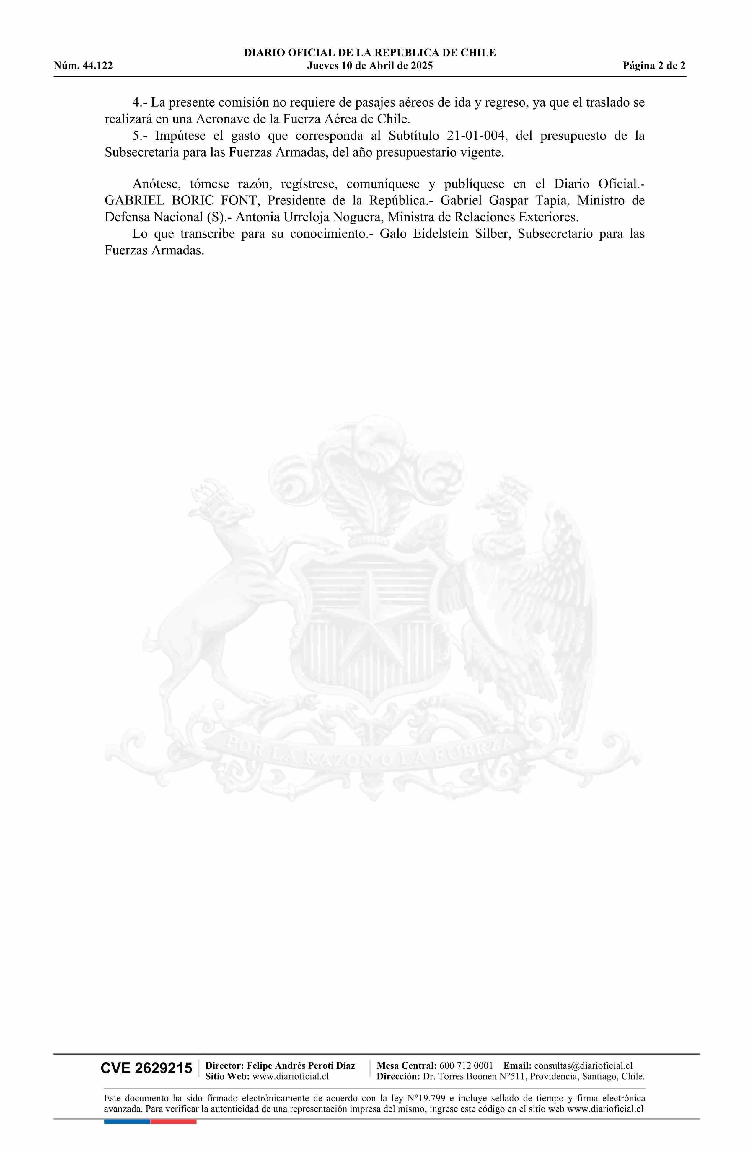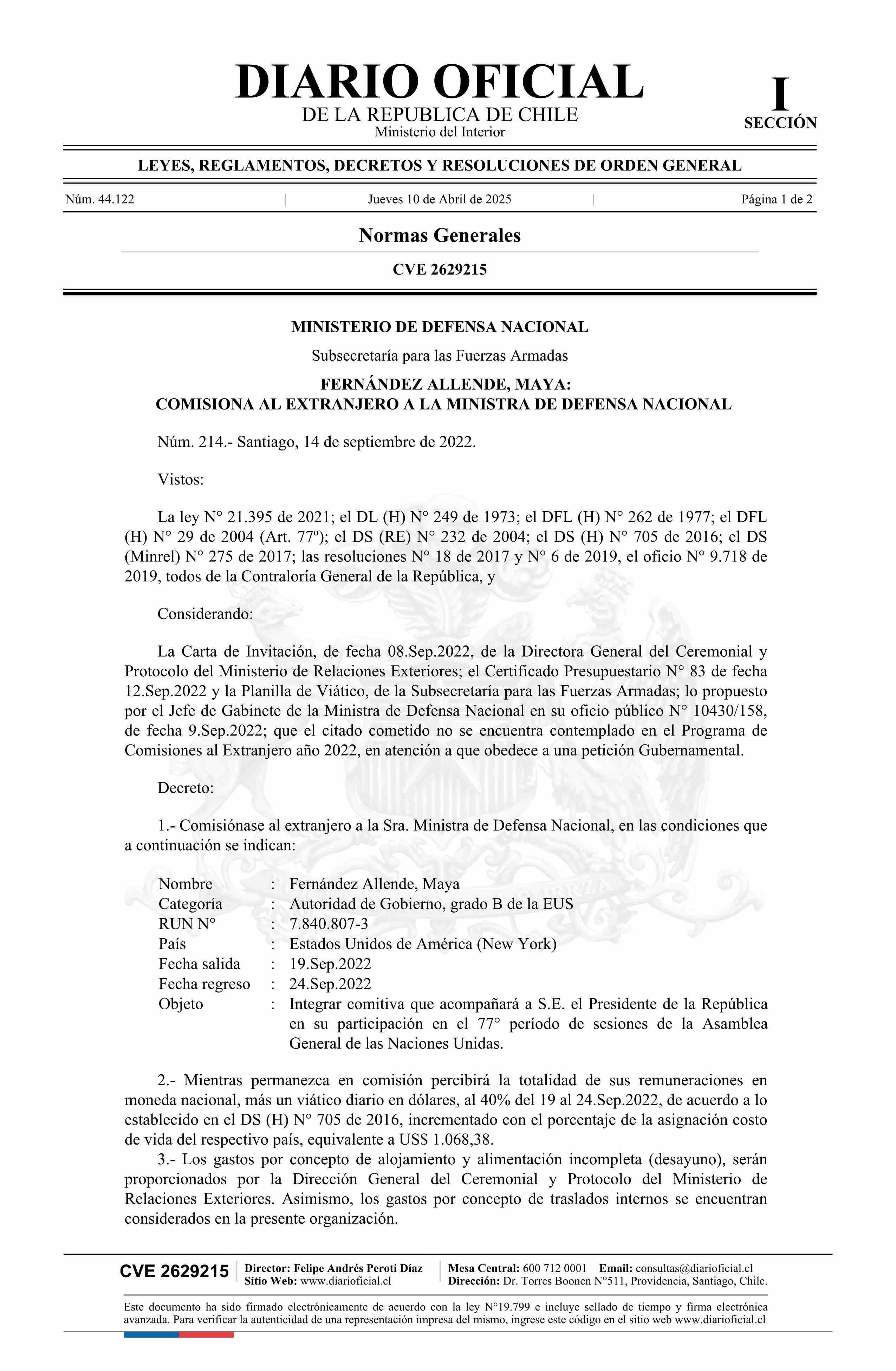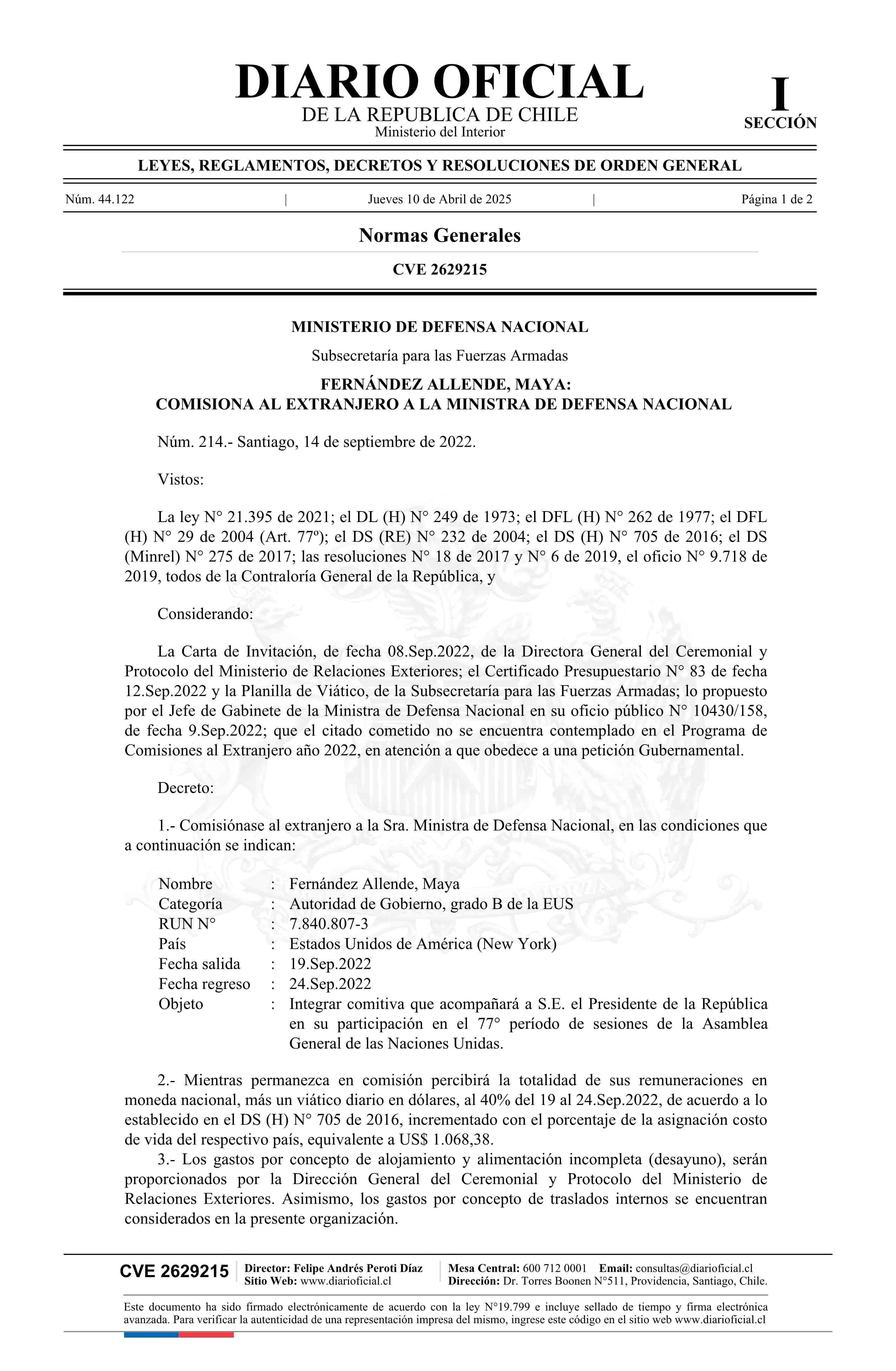Decreto número 214, de 2022.- Designa en comisión de servicio a doña Maya Fernández Allende, Ministra de Defensa Nacional, a la ciudad de Nueva York, Estados Unidos 10-04-2025 Diario Oficial Edición Electrónica |