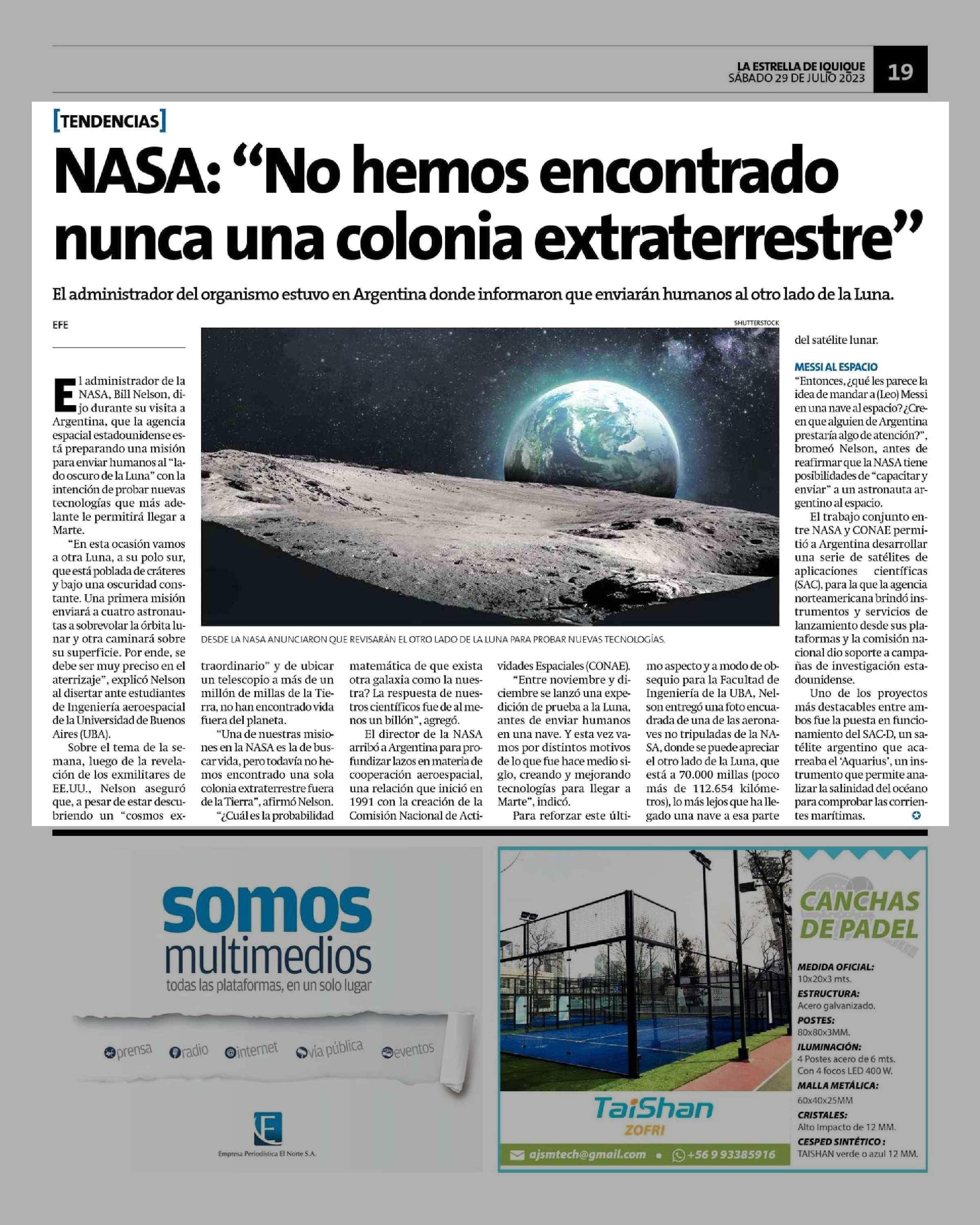 NASA: “No hemos encontrado nunca una colonia extraterrestre” 29-07-2023 La Estrella de Iquique |