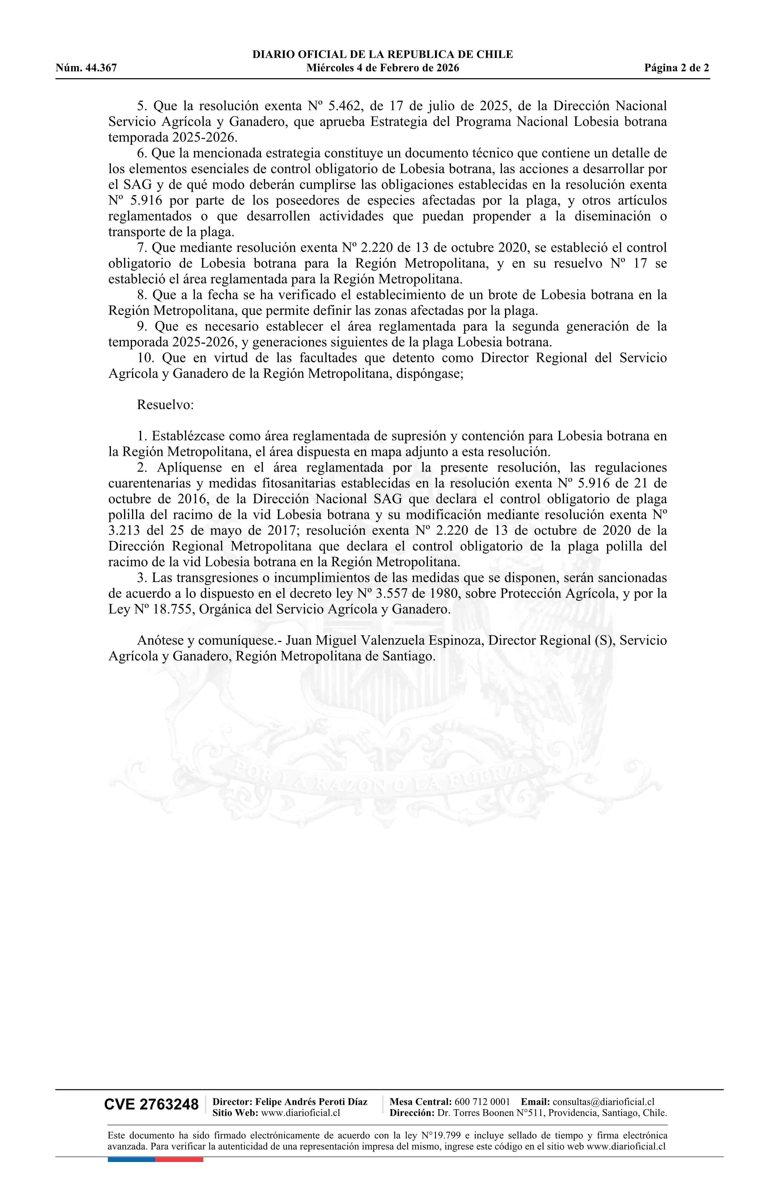 | Título: | Resolución exenta número 232, de 2026.- Establece área reglamentada por Polilla del racimo de la vid (Lobesia botrana) en la Región Metropolitana para la segunda generación de la temporada 2025-2026 |