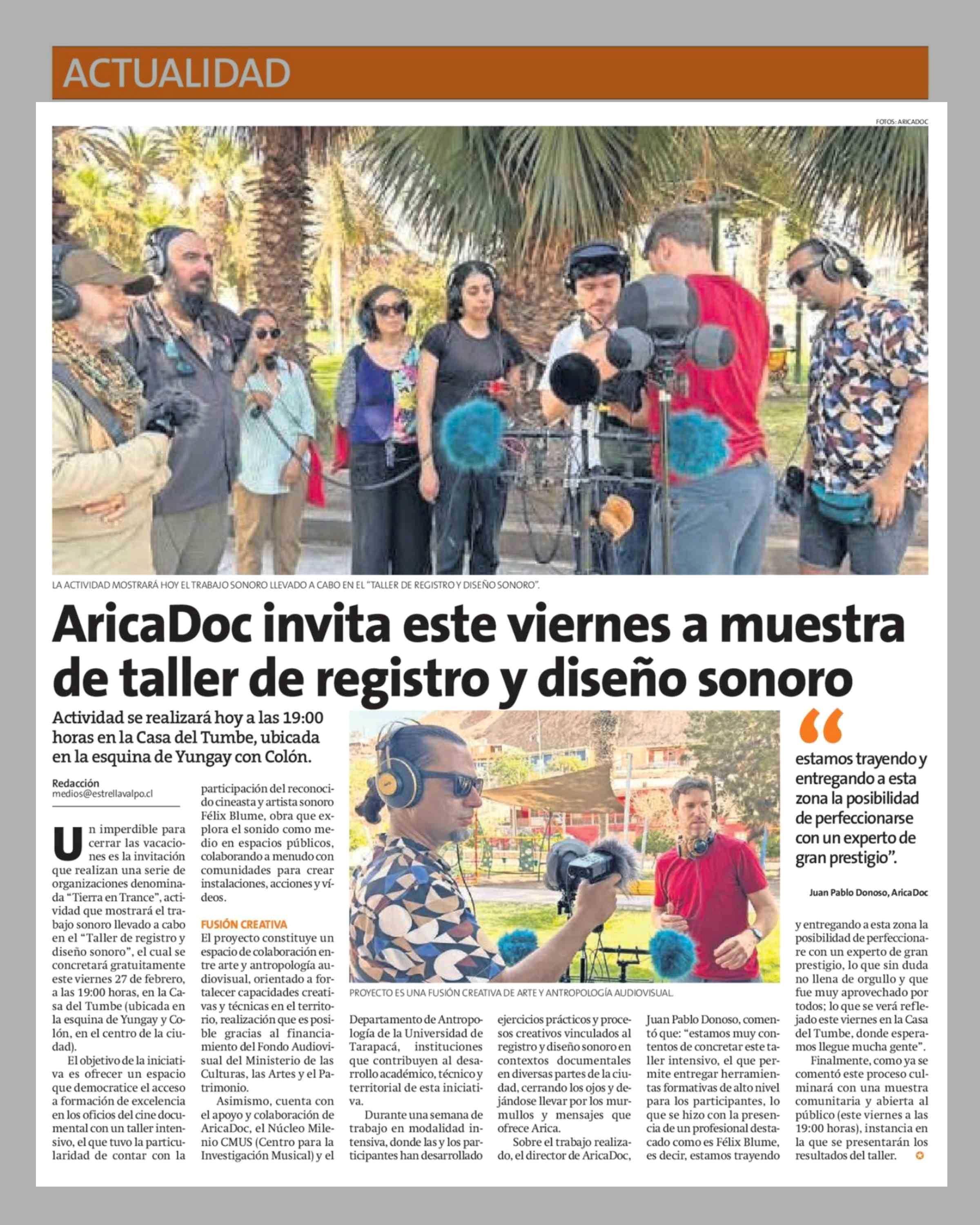Título: AricaDoc invita este viernes a muestra de taller de registro y diseño sonoro
