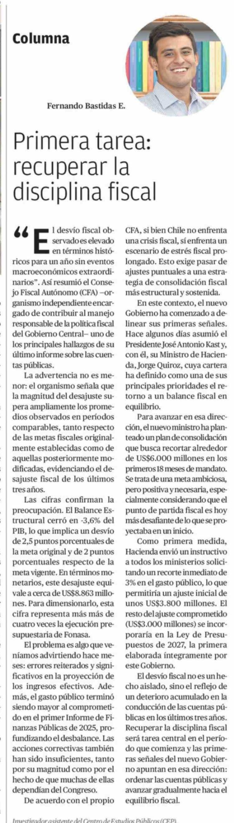 Columnas de Opinión: Primera tarea: recuperar la disciplina fiscal 15-03-2026 El Mercurio de Calama |