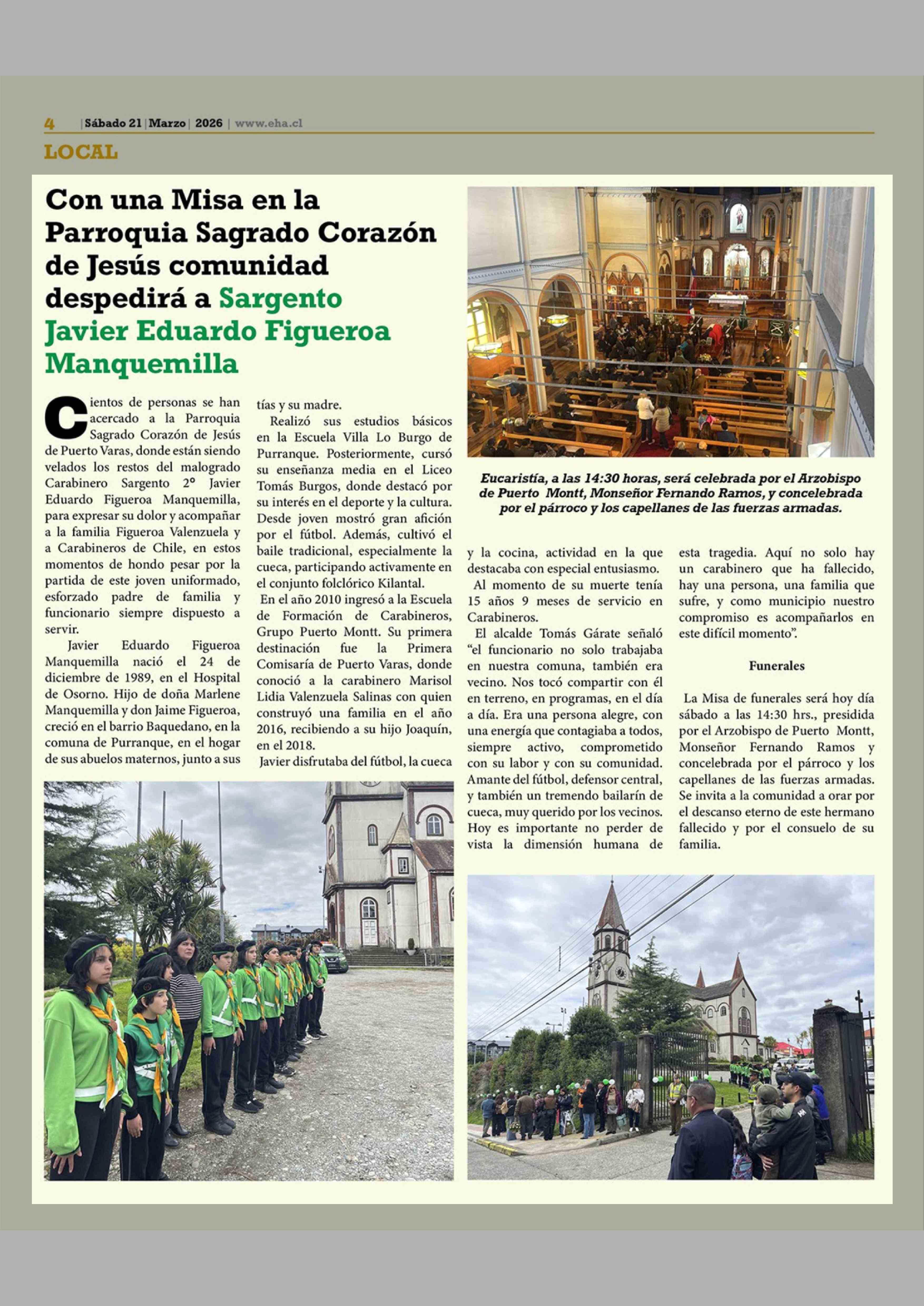 Con una Misa en la Parroquia Sagrado Corazón de Jesús comunidad despedirá a Sargento Javier Eduardo Figueroa Manquemilla 21-03-2026 El Heraldo Austral |