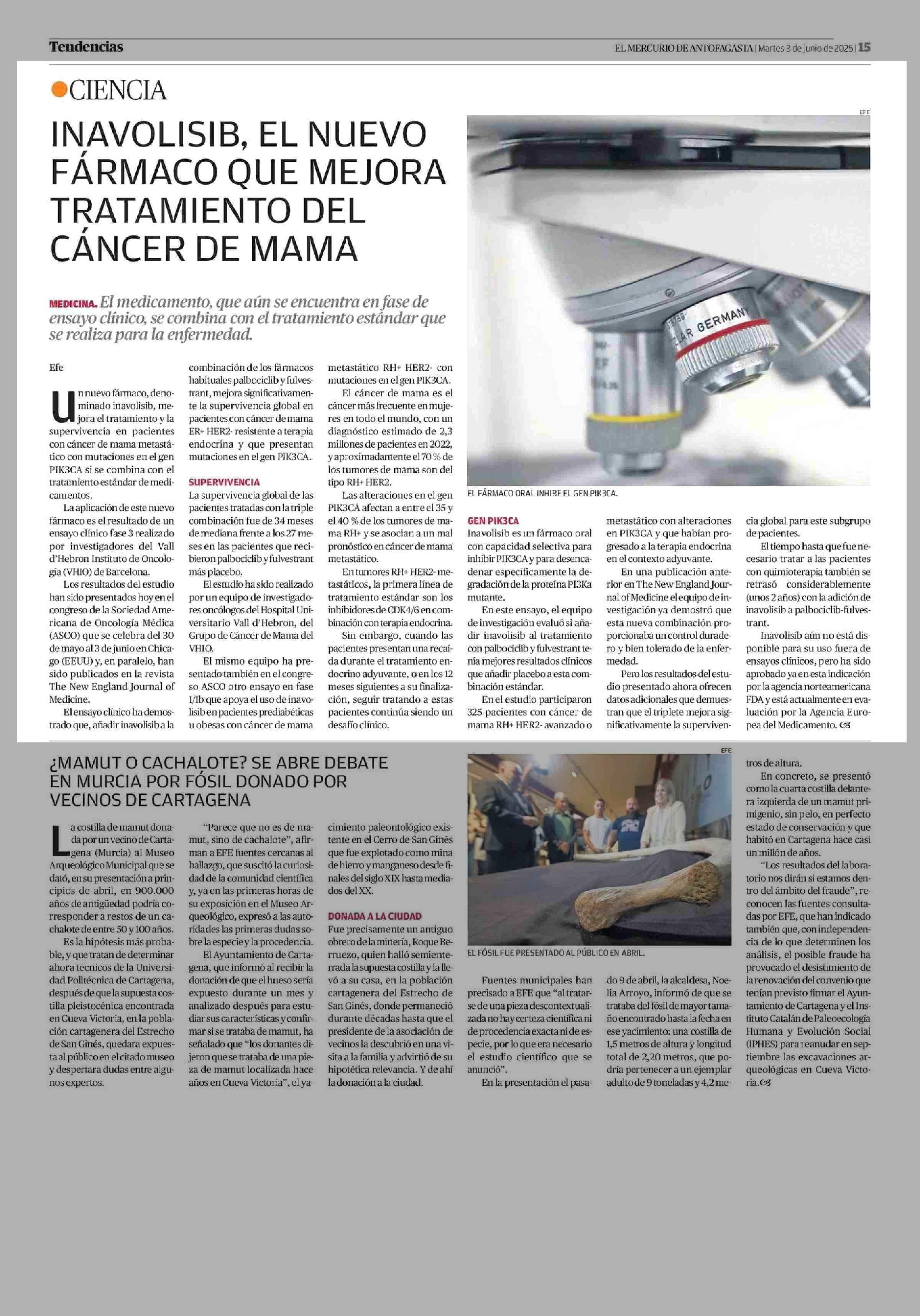 INAVOLISIB, EL NUEVO FARMACO QUE MEJORA TRATAMIENTO DEL CANCER DE MAMA 03-06-2025 El Mercurio de Antofagasta |