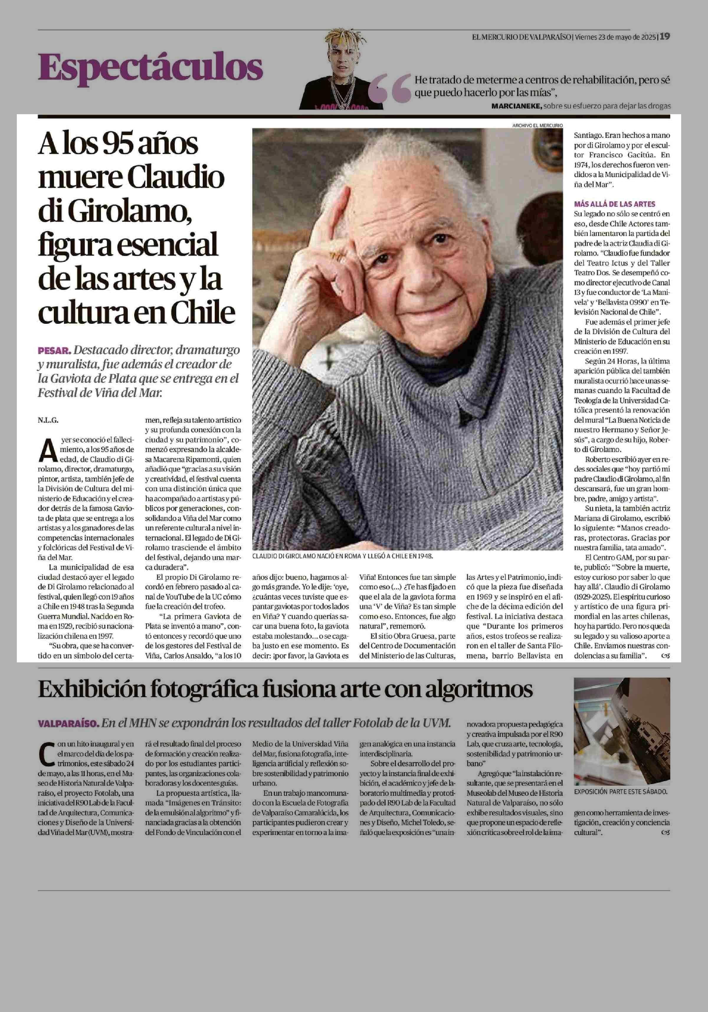 Alos 95 años muere Claudio di Girolamo, figura esencial de las artes y la cultura en Chile 23-05-2025 El Mercurio de Valparaíso |