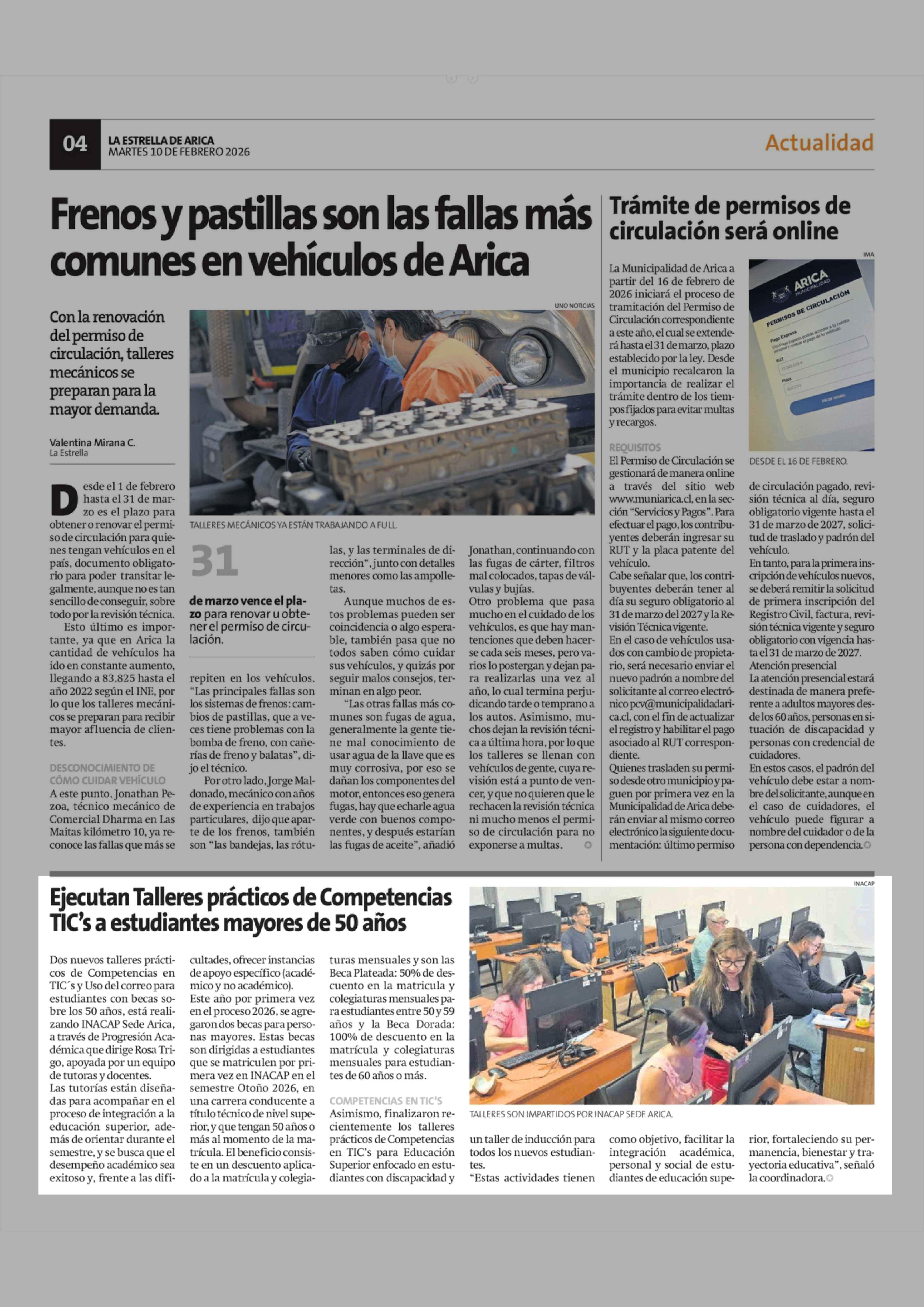 Ejecutan Talleres prácticos de Competencias TIC's a estudiantes mayores de 50 años 10-02-2026 La Estrella de Arica |