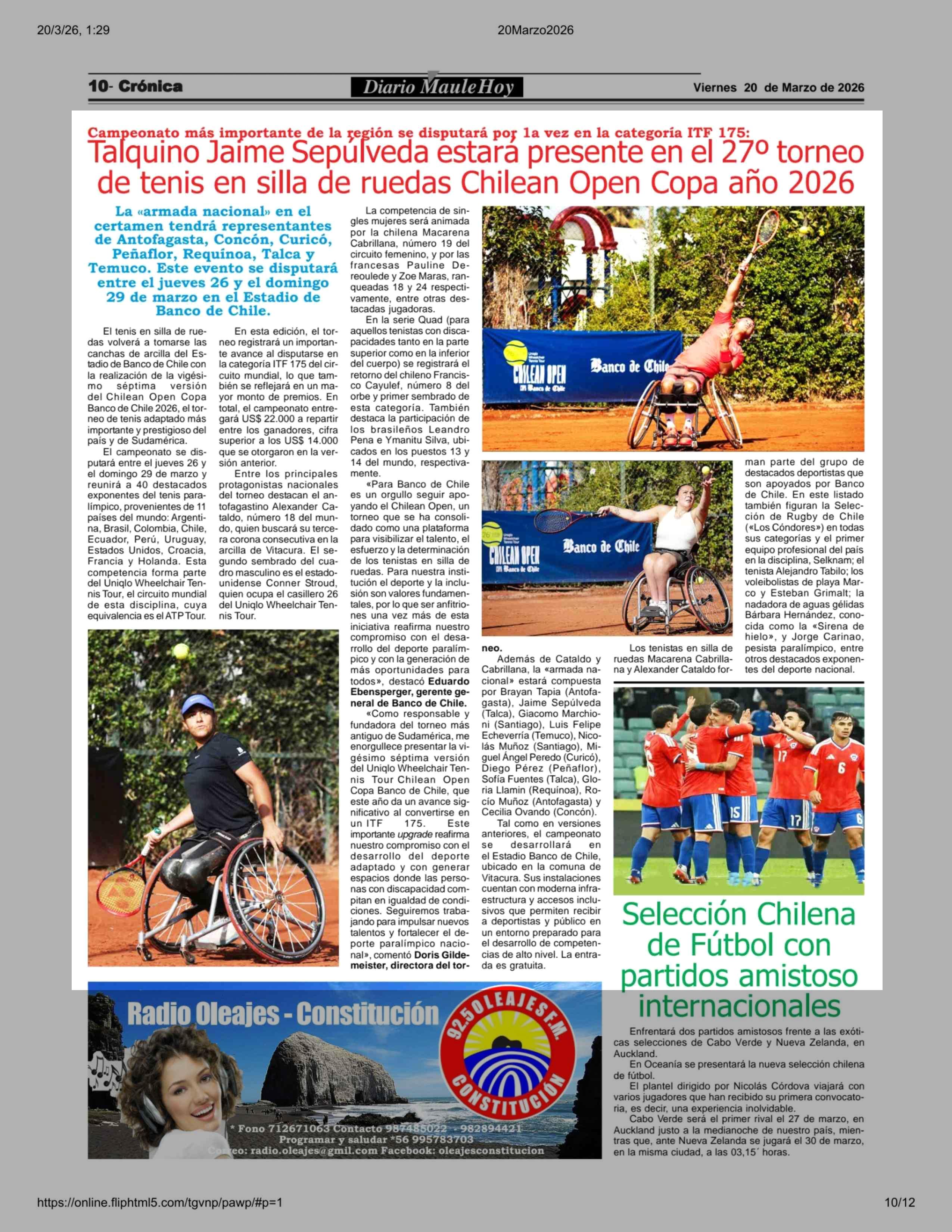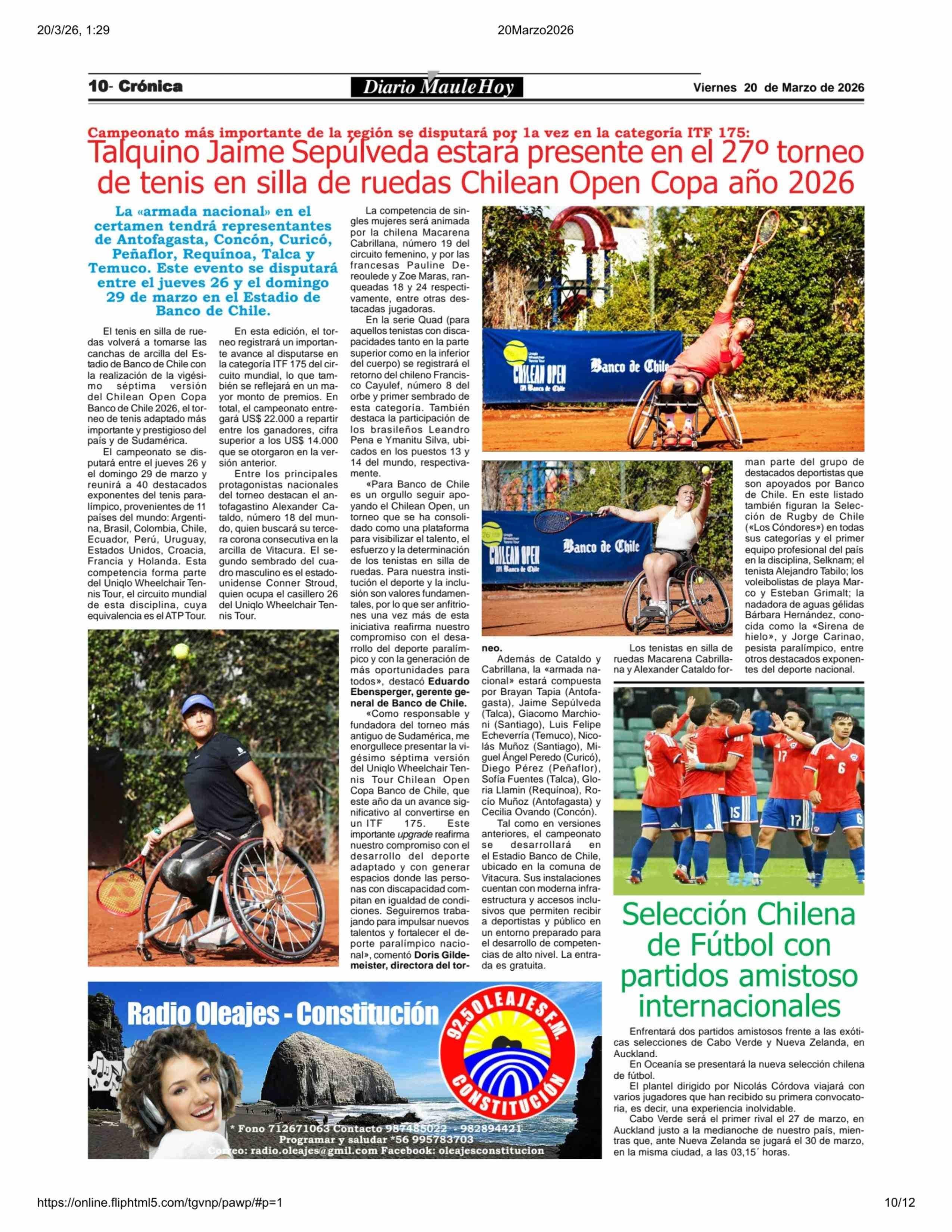 Título: Talquino Jaime Sepúlveda estará presente en el 27º torneo de tenis en silla de ruedas Chilean Open Copa año 2026