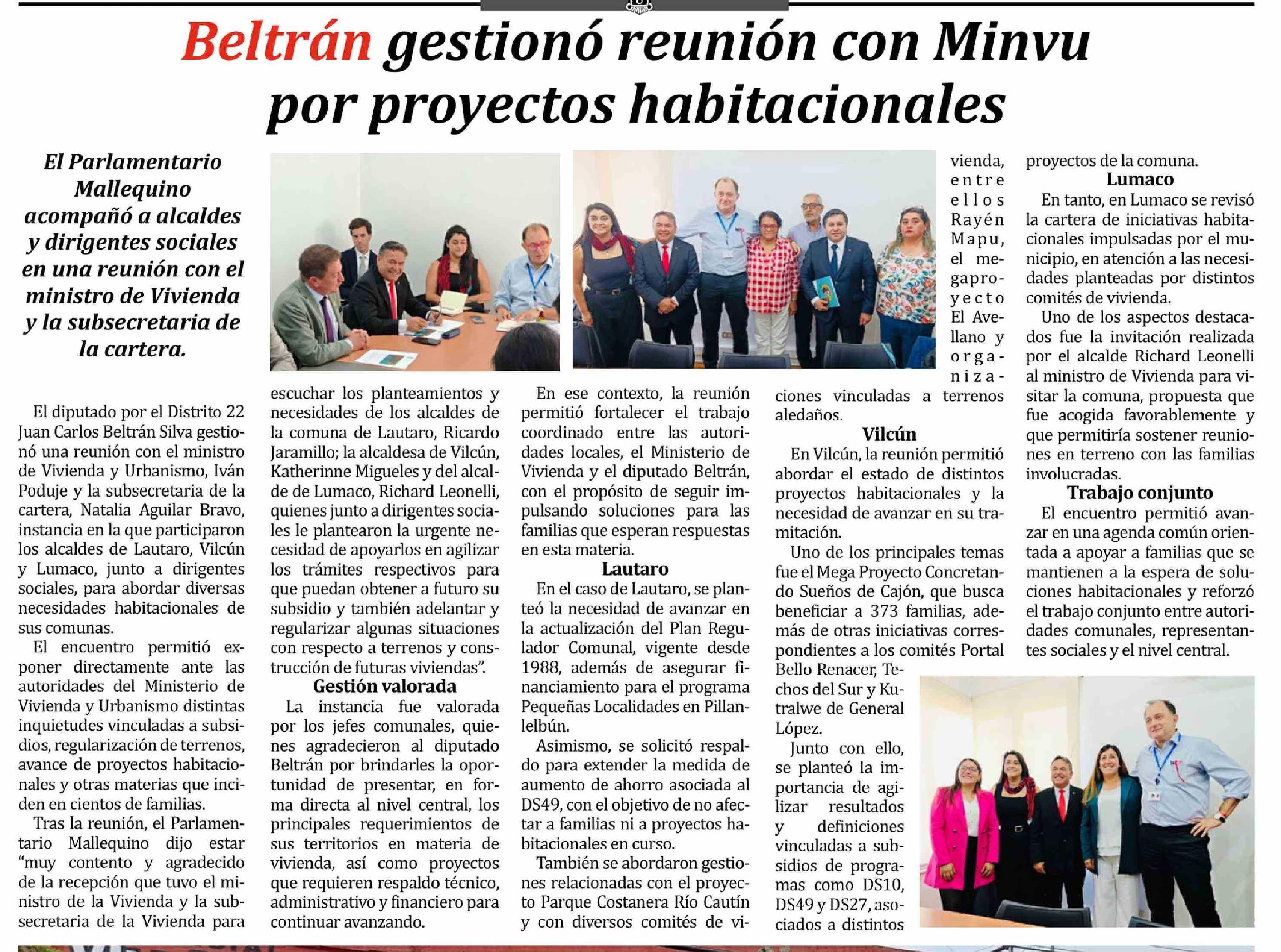| Título: | Beltrán gestionó reunión con Minvu por proyectos habitacionales |