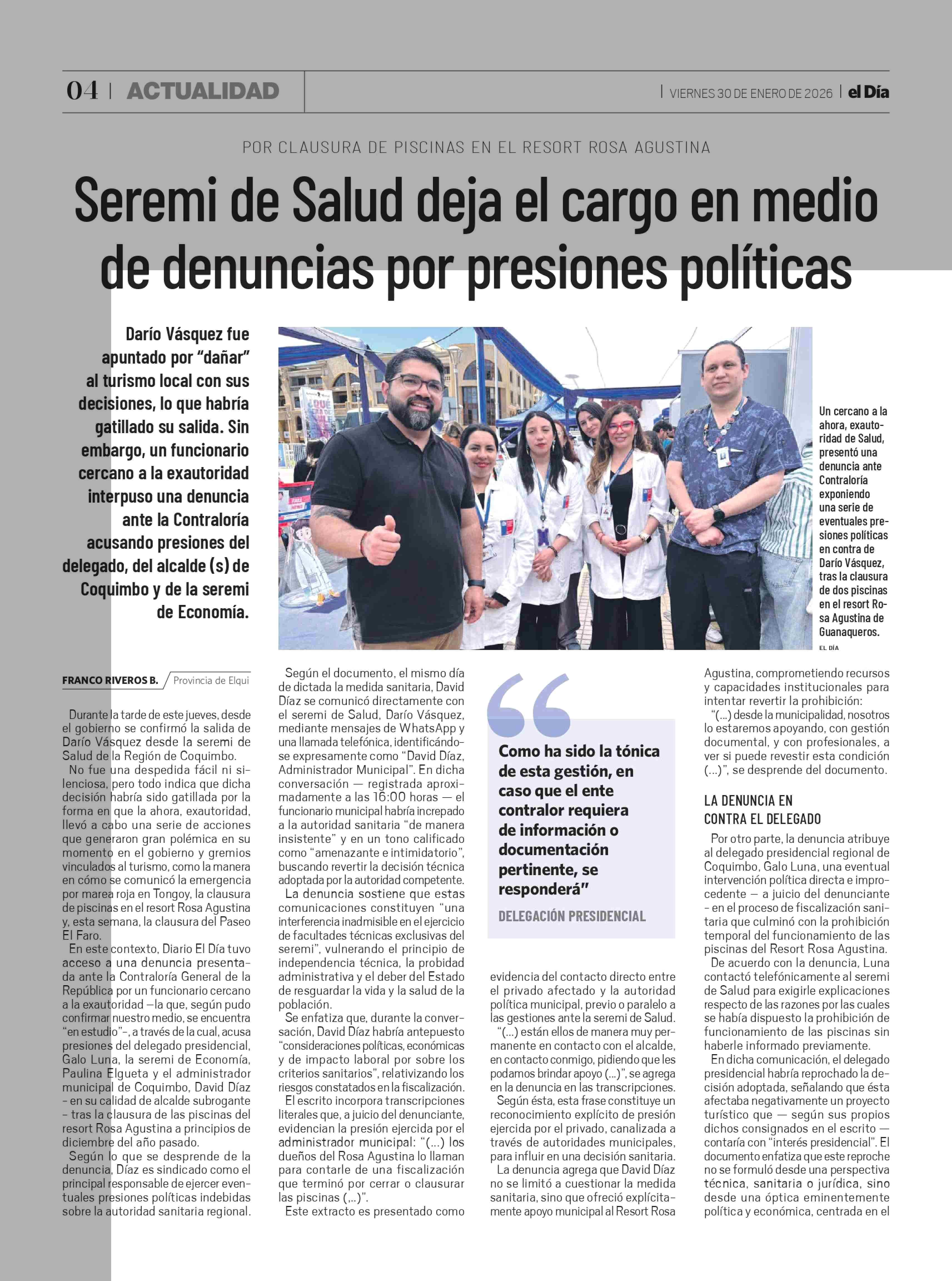 Seremi de Salud deja el cargo en medio de denuncias por presiones políticas 30-01-2026 El Día |