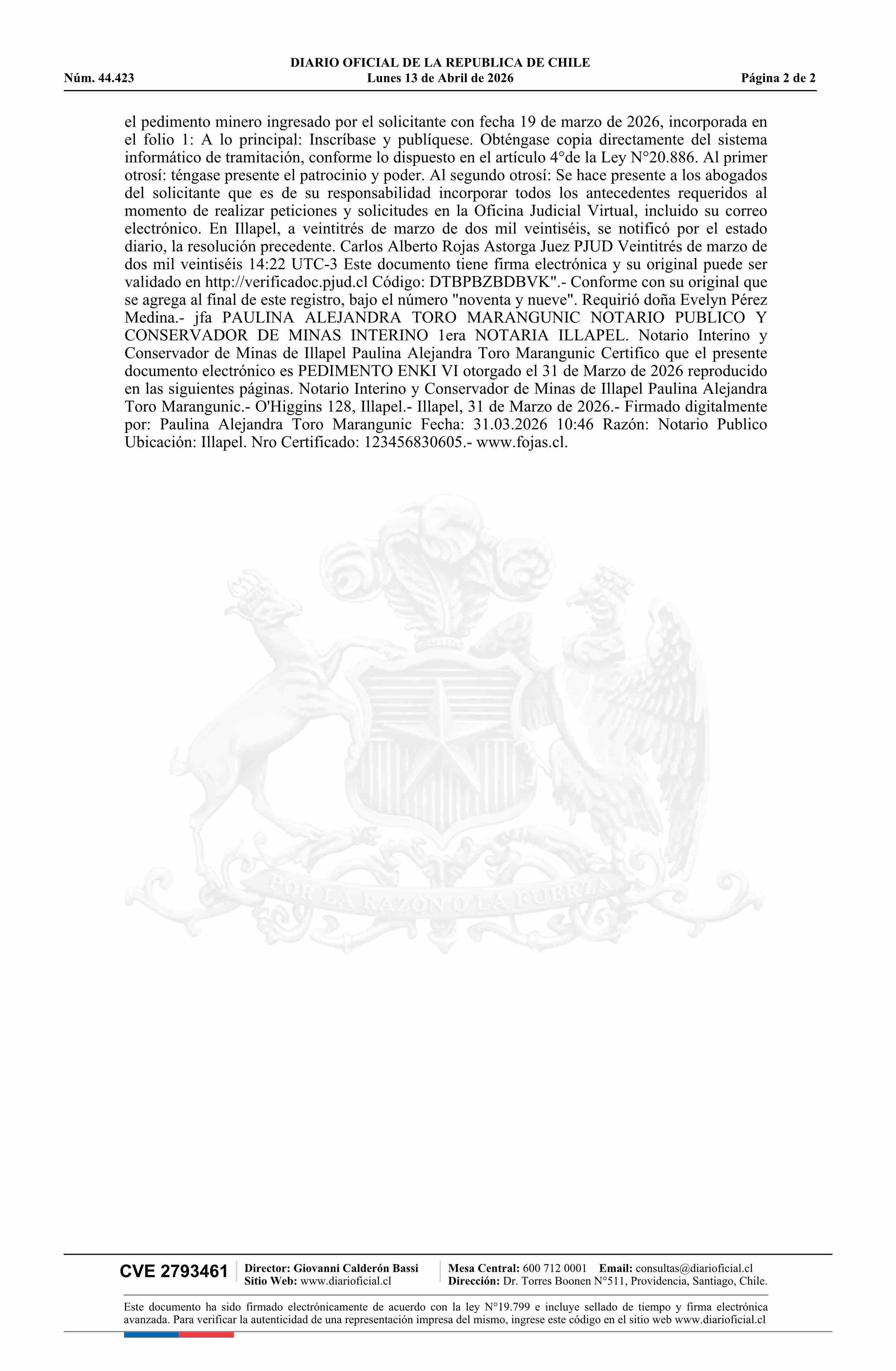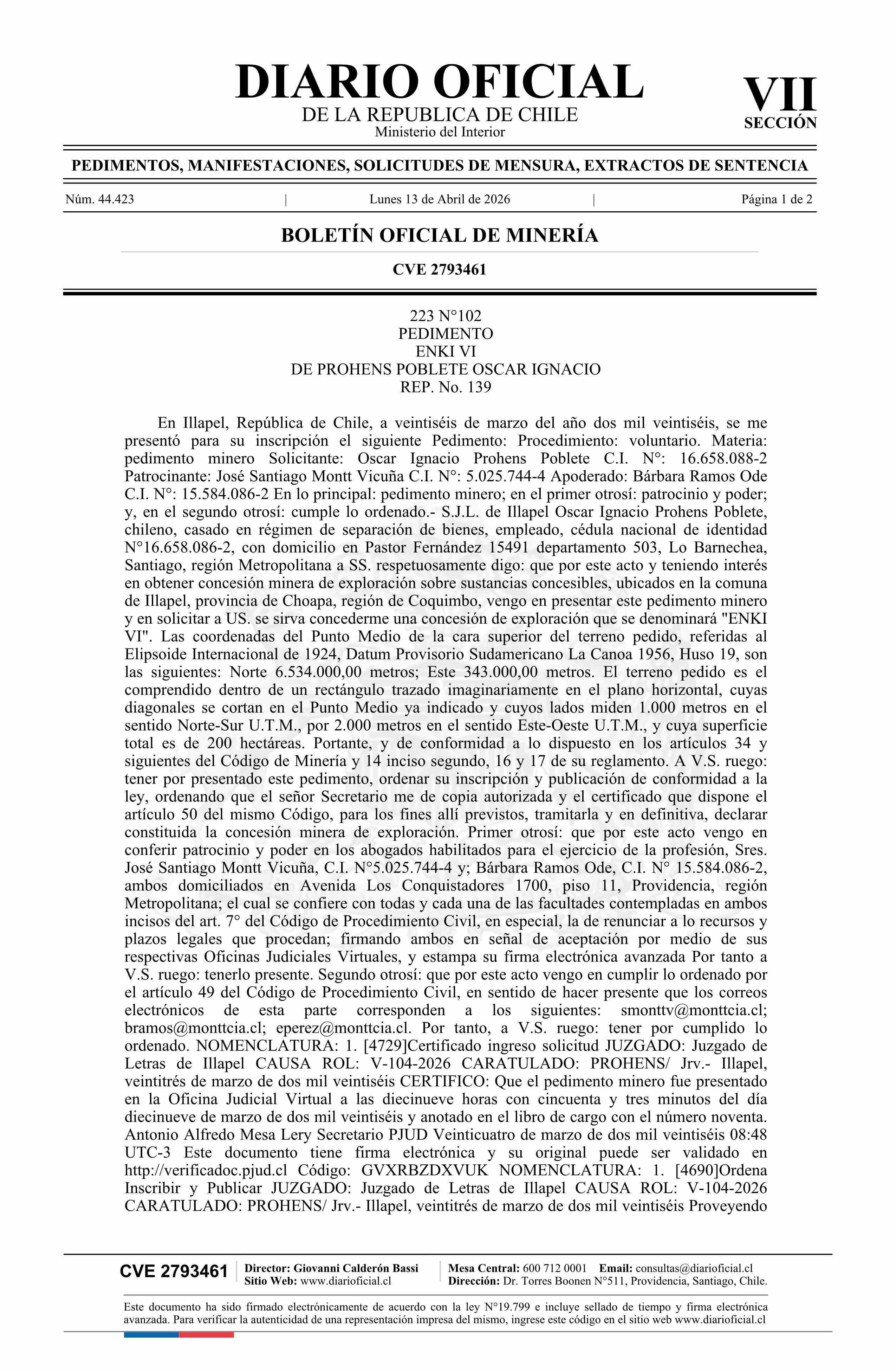 ENKI VI / Prohens Poblete Óscar Ignacio 13-04-2026 DIARIO OFICIAL CHILE - BOLETÍN OFICIAL DE MINERÍA |