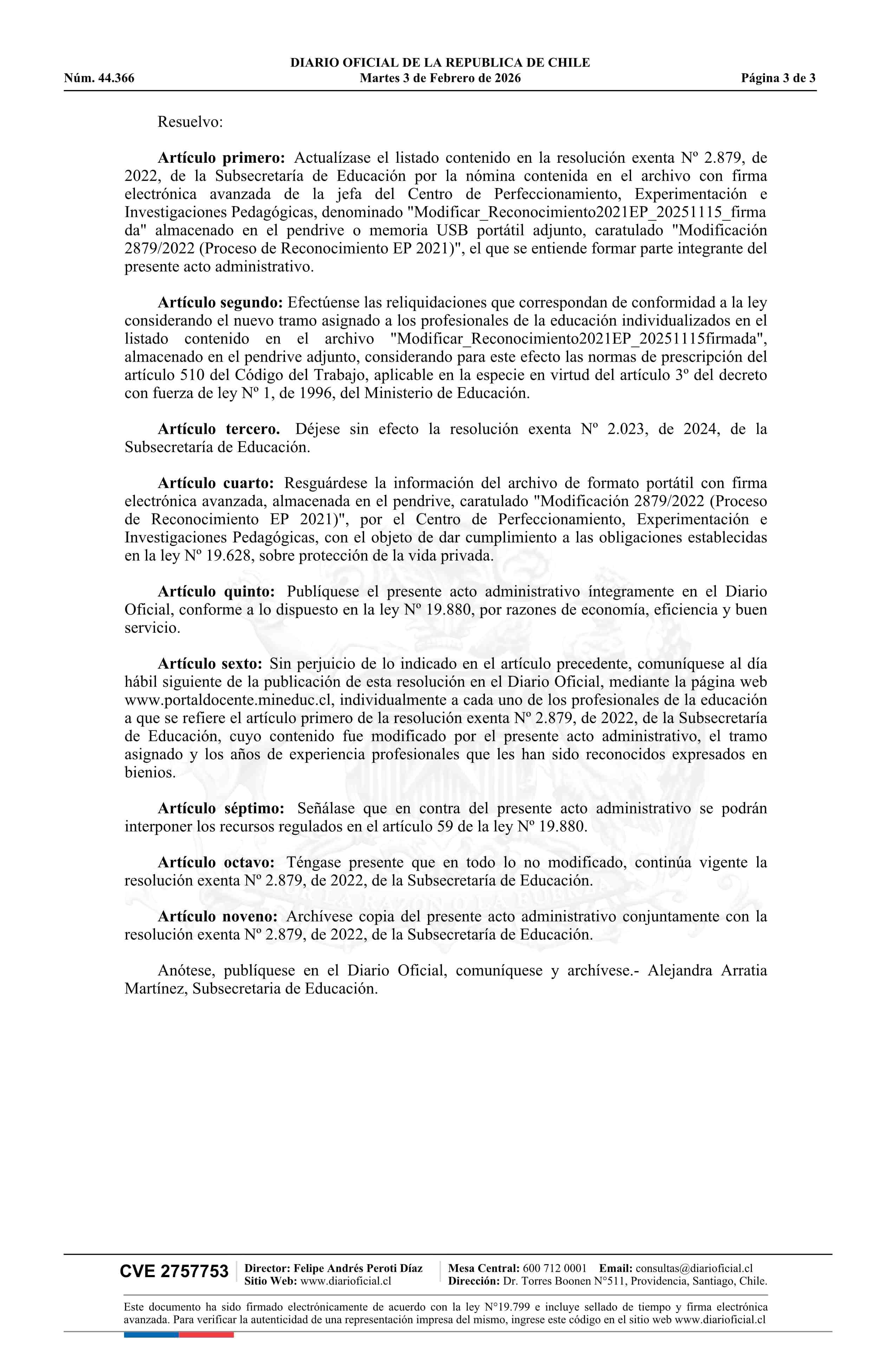 Título: Resolución exenta número 154, de 2026.- Actualiza listado contenido en la resolución Nº 2.879 exenta, de 2022, ordenando las reliquidaciones que indica y deja sin efecto la resolución Nº 2.023 exenta, de 2024