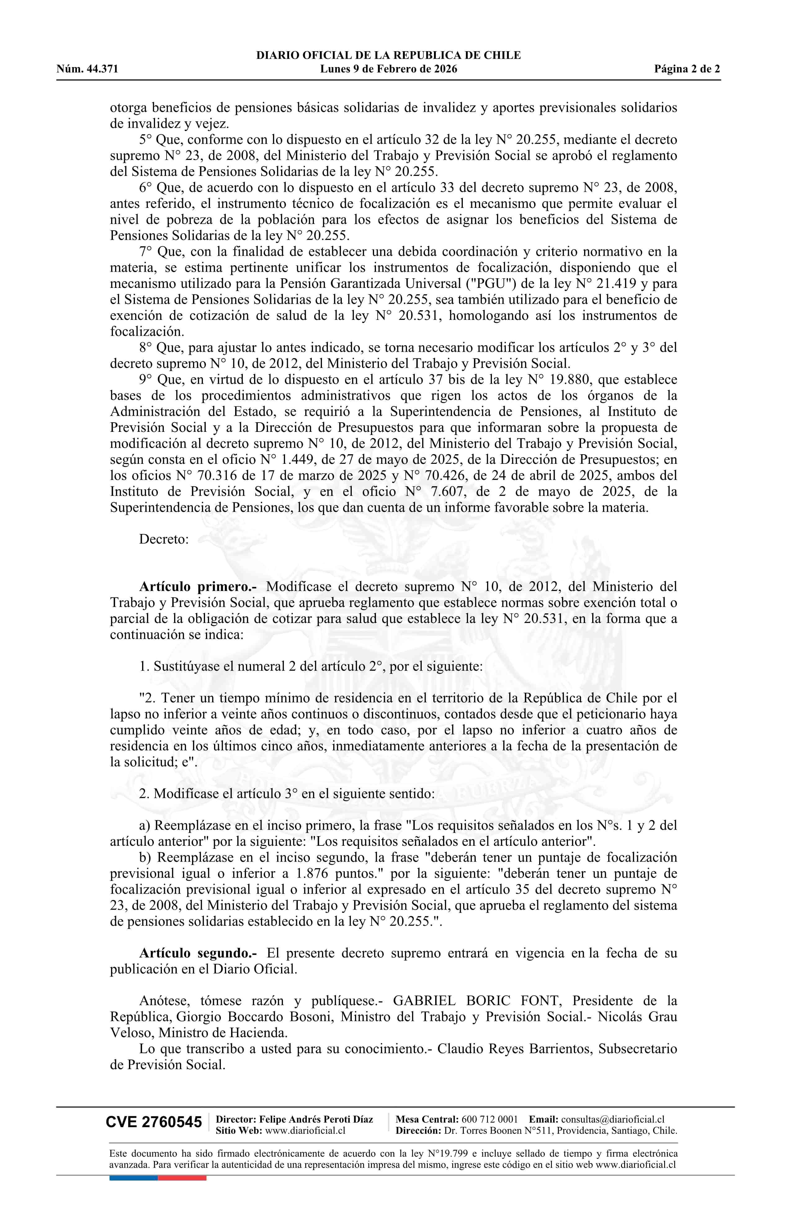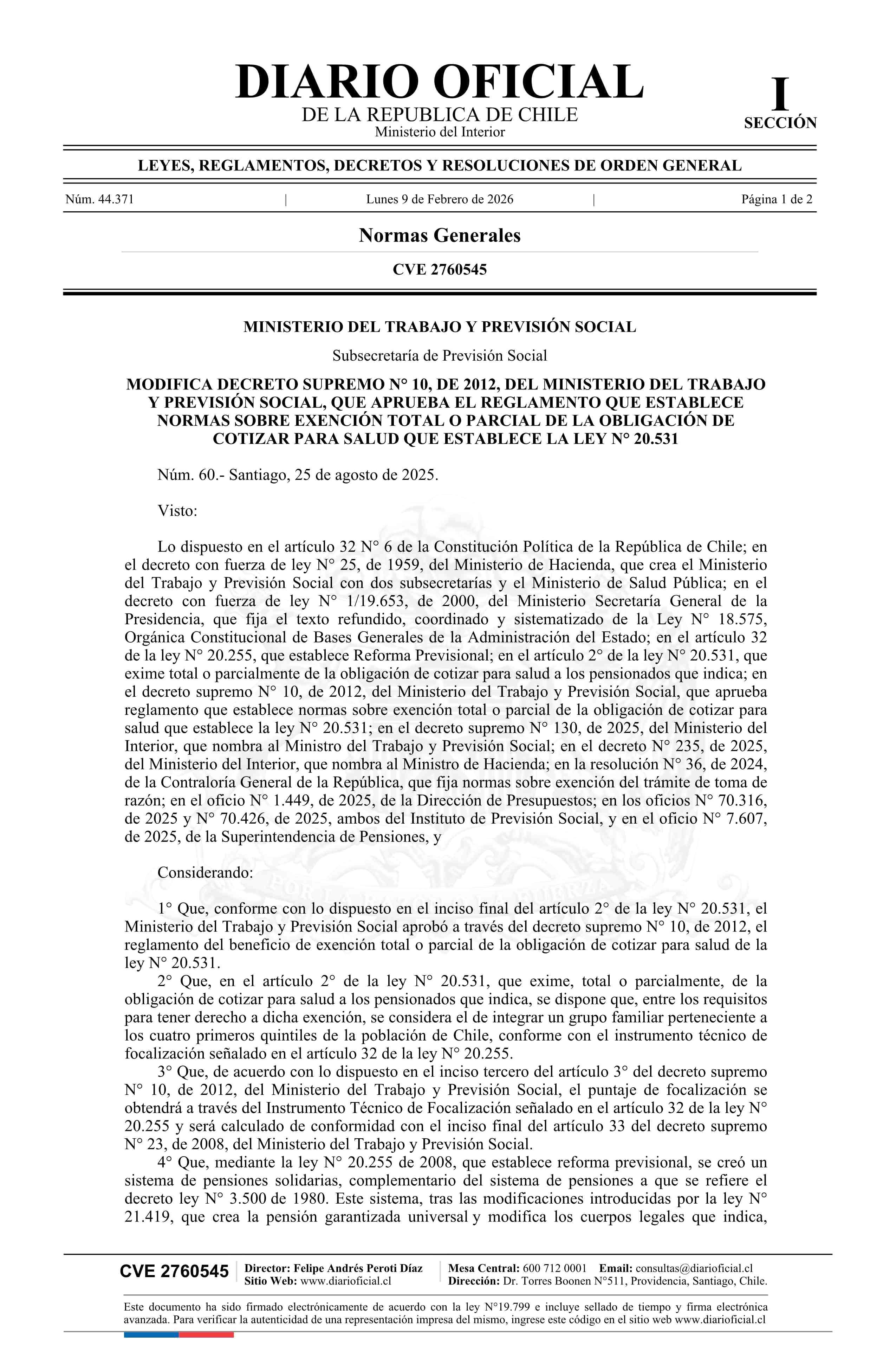 | Título: | Decreto número 60, de 2025.- Modifica decreto N° 10, de 2012, que aprueba reglamento que establece normas sobre exención total o parcial de la obligación de cotizar para salud que establece la ley N° 20.531 |