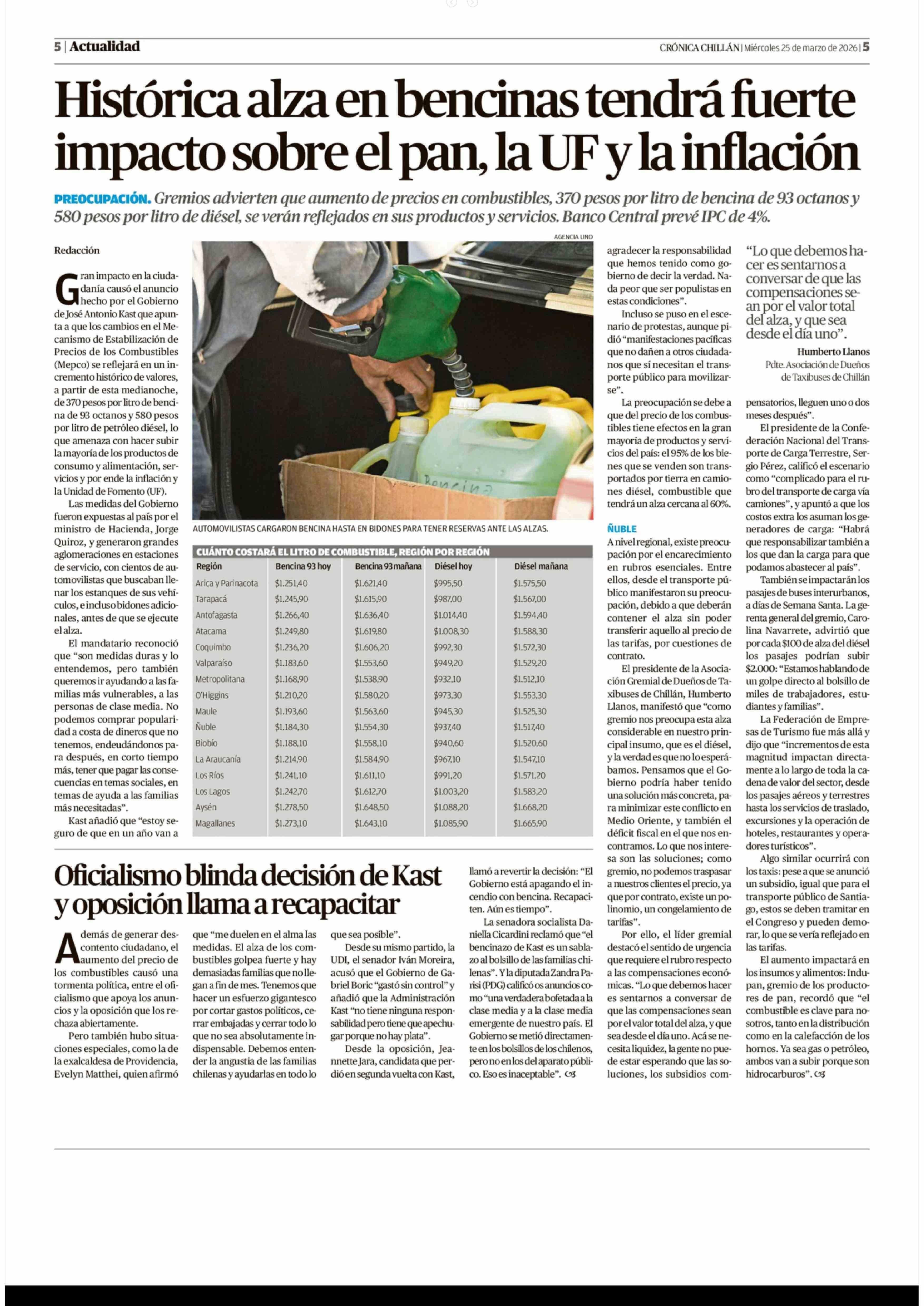 Histórica alza en bencinas tendrá fuerte impacto sobre el pan, la UF y la inflación 25-03-2026 Crónica de Chillán |