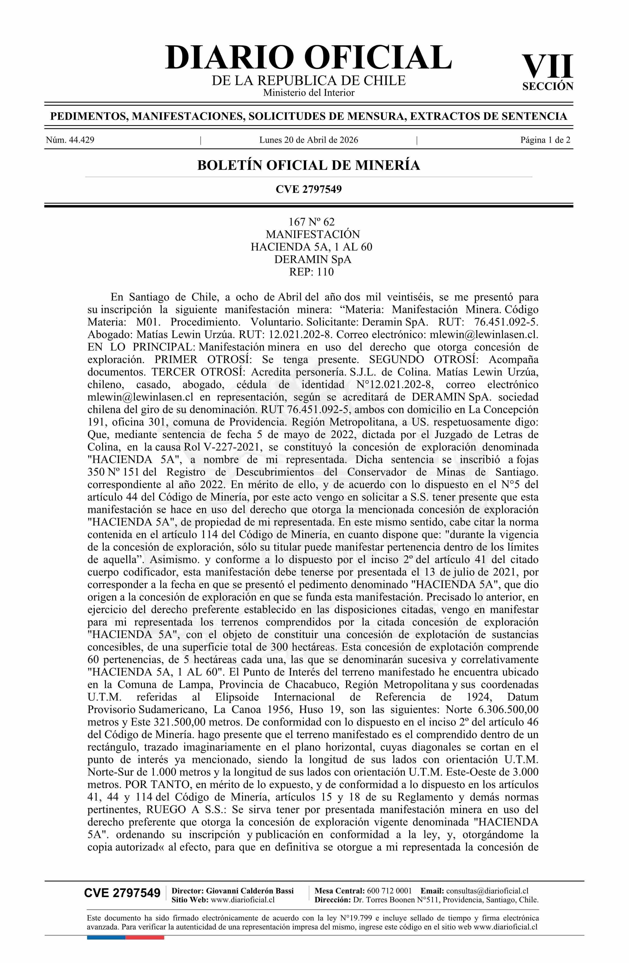 HACIENDA 5A, 1 AL 60 / Deramin SpA 20-04-2026 DIARIO OFICIAL CHILE - BOLETÍN OFICIAL DE MINERÍA |