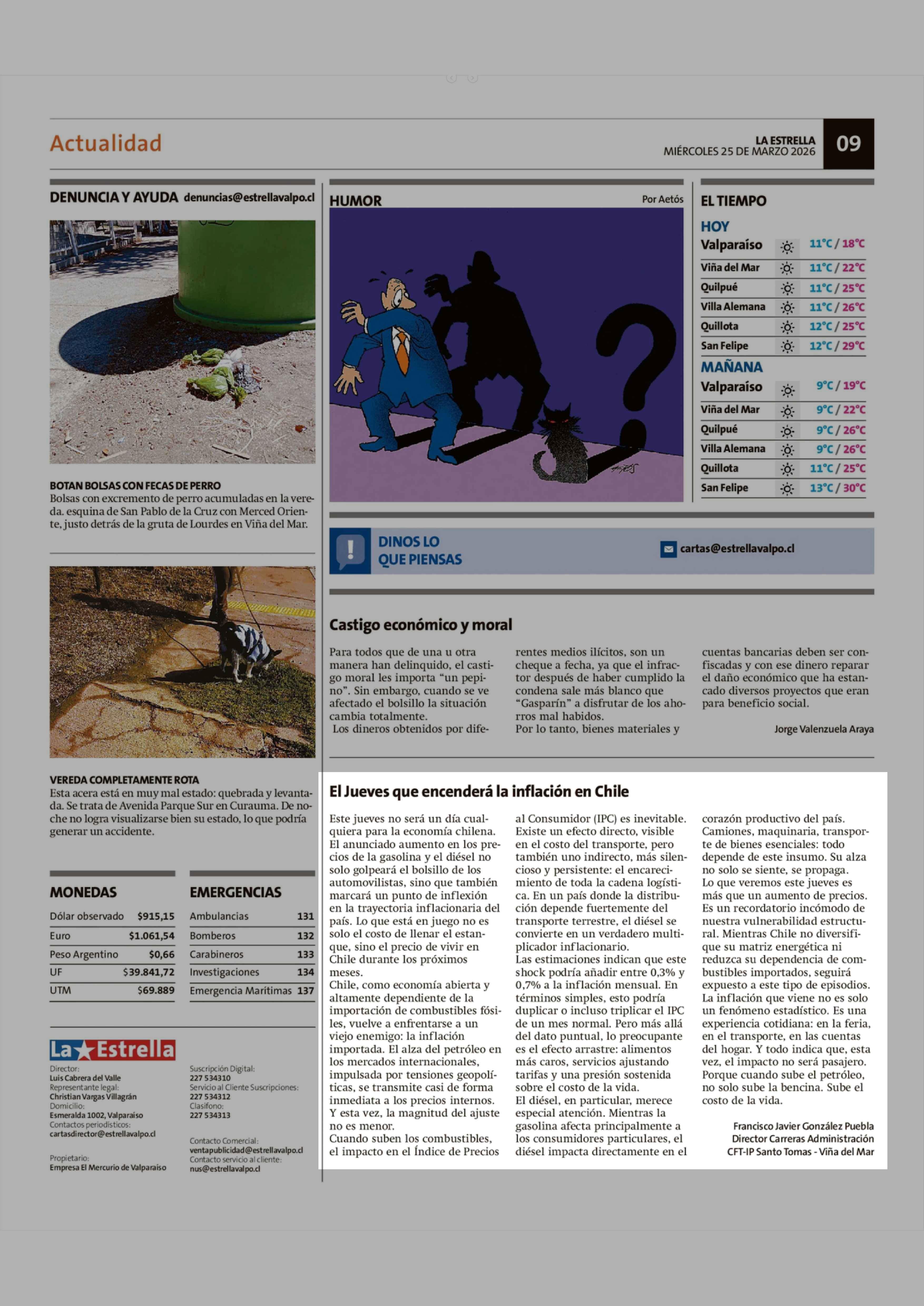 Cartas: El Jueves que encenderá la inflación en Chile 25-03-2026 La Estrella de Valparaíso |