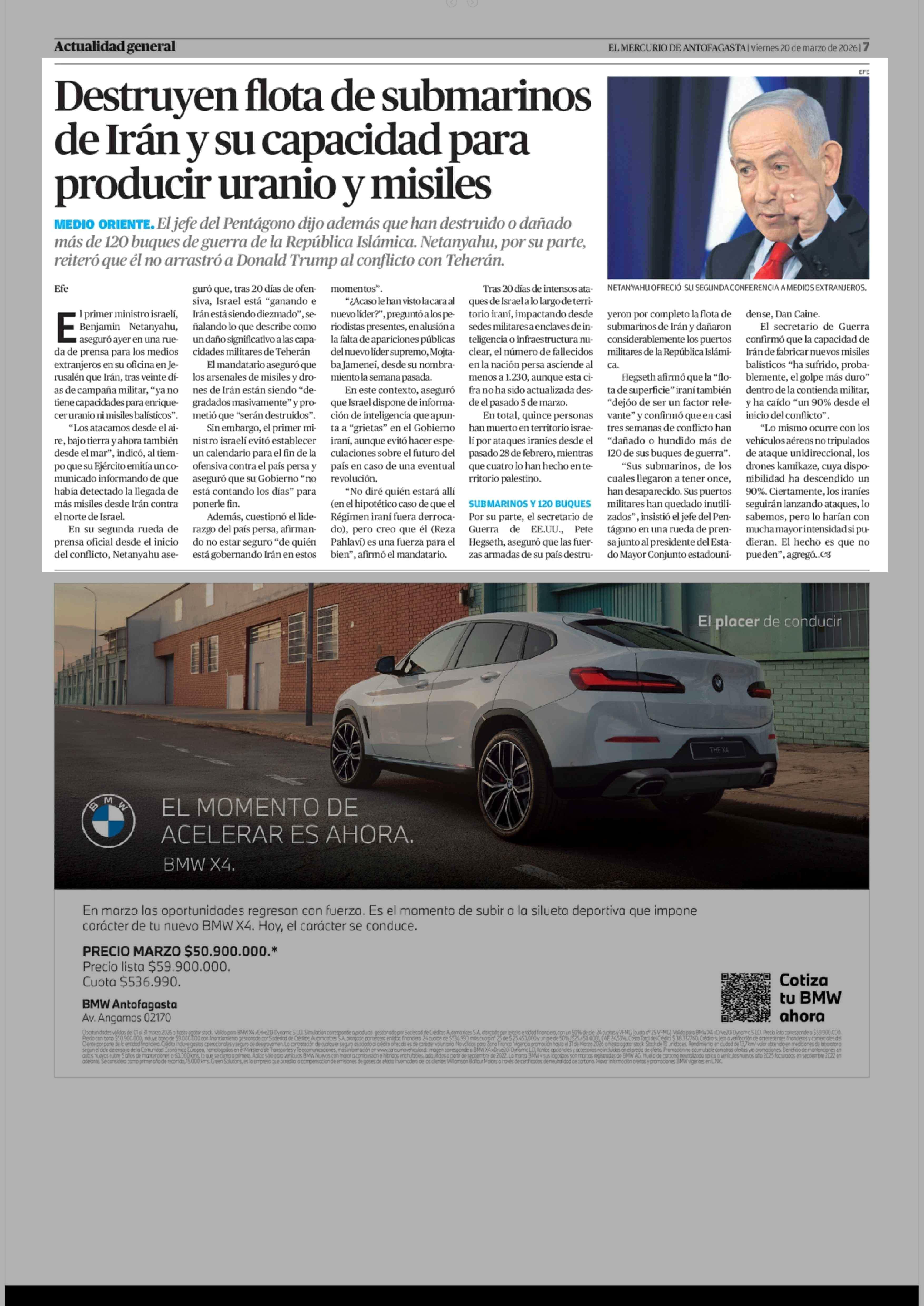 Destruyen flota de submarinos de Irán y su capacidad para producir uranio y misiles 20-03-2026 El Mercurio de Antofagasta |