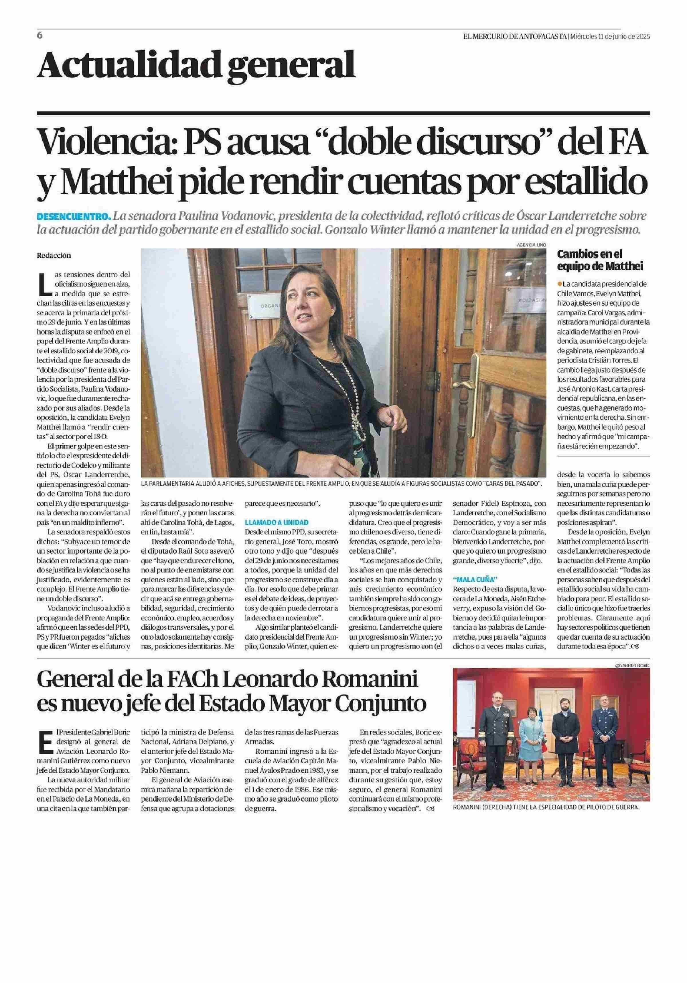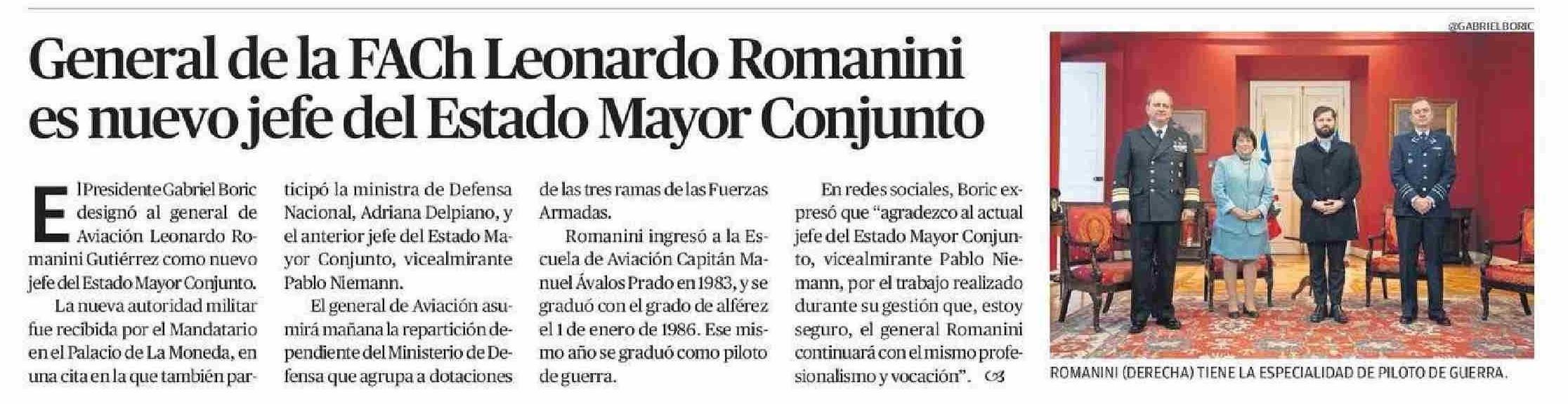 General de la FACh Leonardo Romanini es nuevo jefe del Estado Mayor Conjunto 11-06-2025 El Mercurio de Antofagasta |