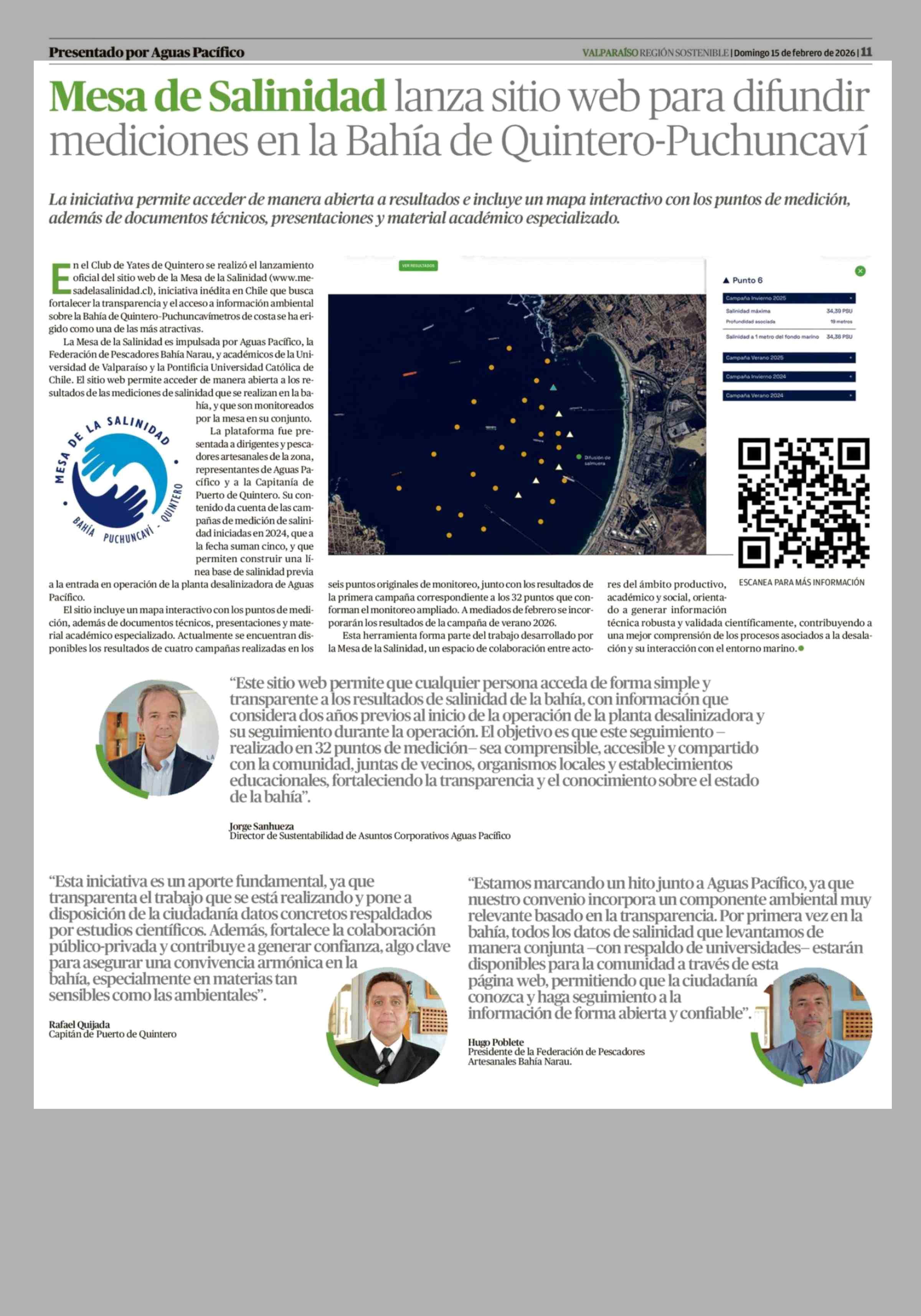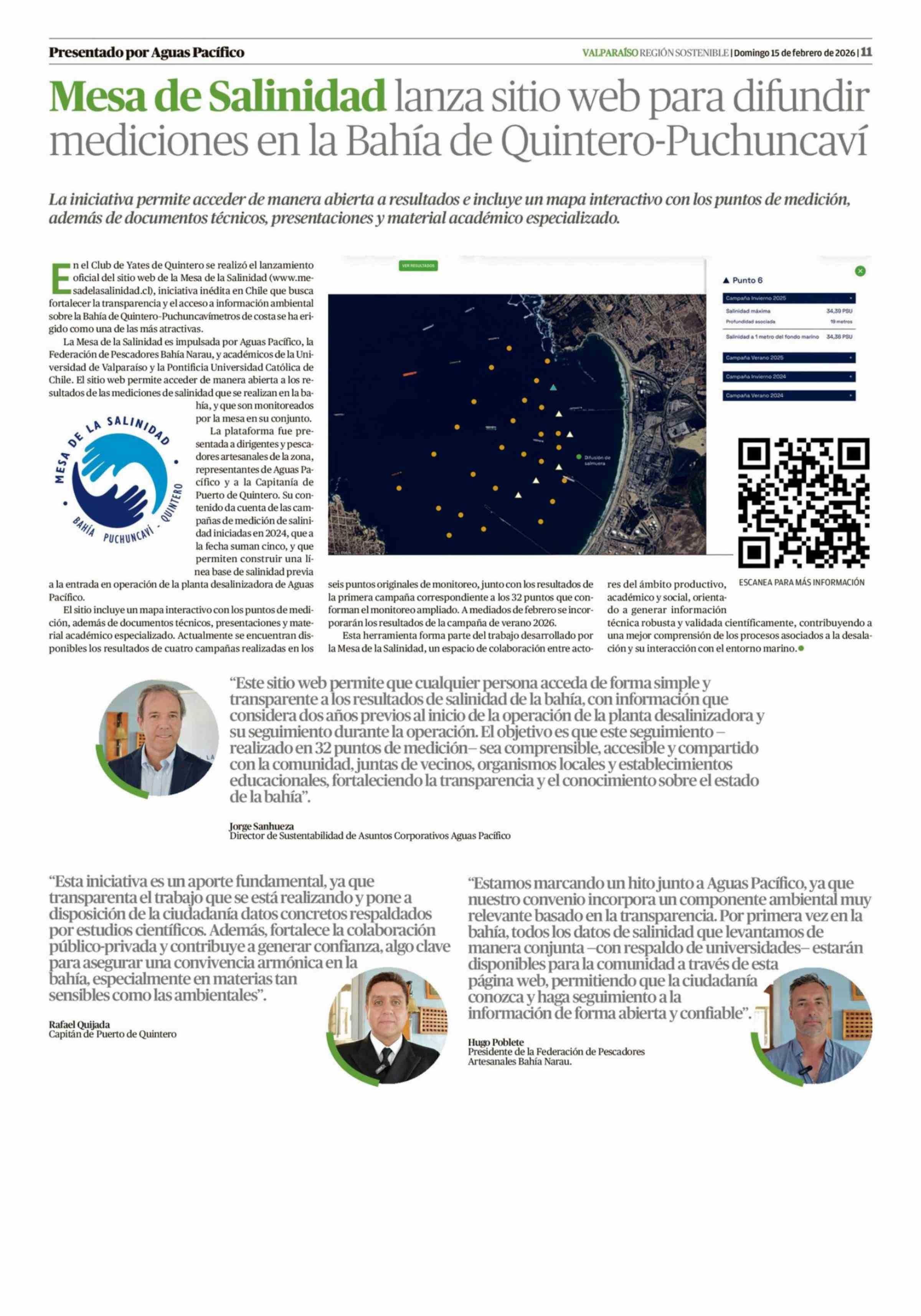 Mesa de Salinidad lanza sitio web para difundir mediciones en la Bahía de Quintero-Puchuncaví 15-02-2026 El Mercurio de Valparaíso |