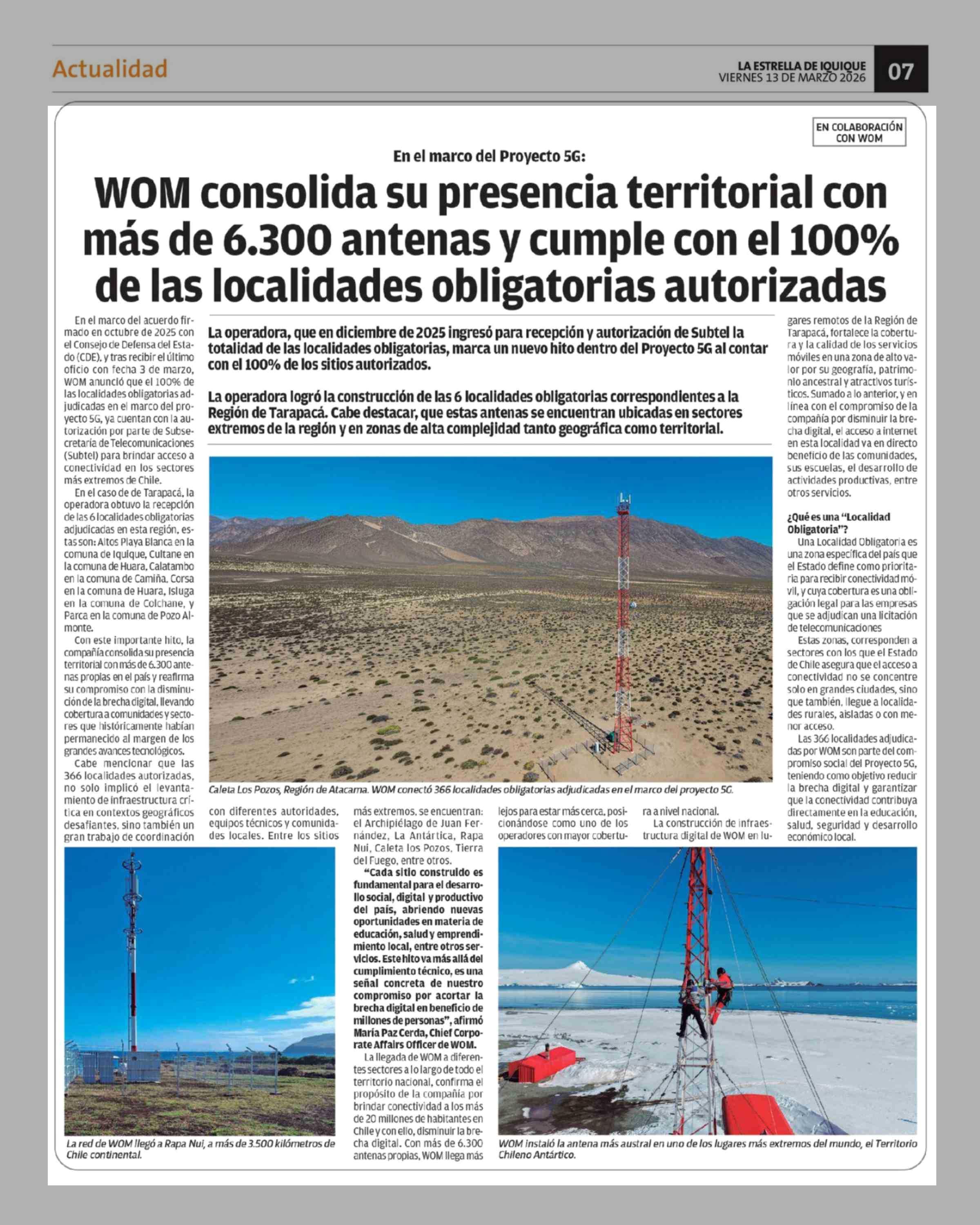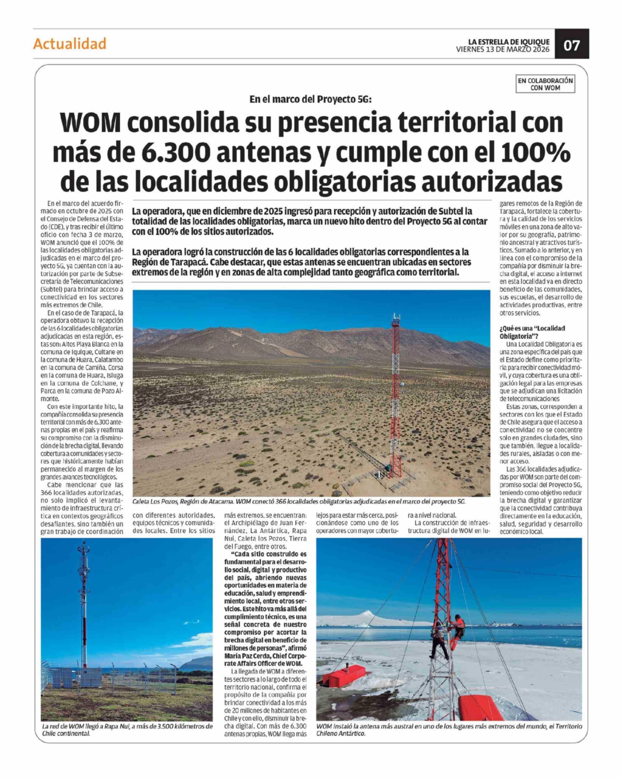 WOM consolida su presencia territorial con más de 6.300 antenas y cumple con el 100% de las localidades obligatorias autorizadas 13-03-2026 La Estrella de Iquique |
