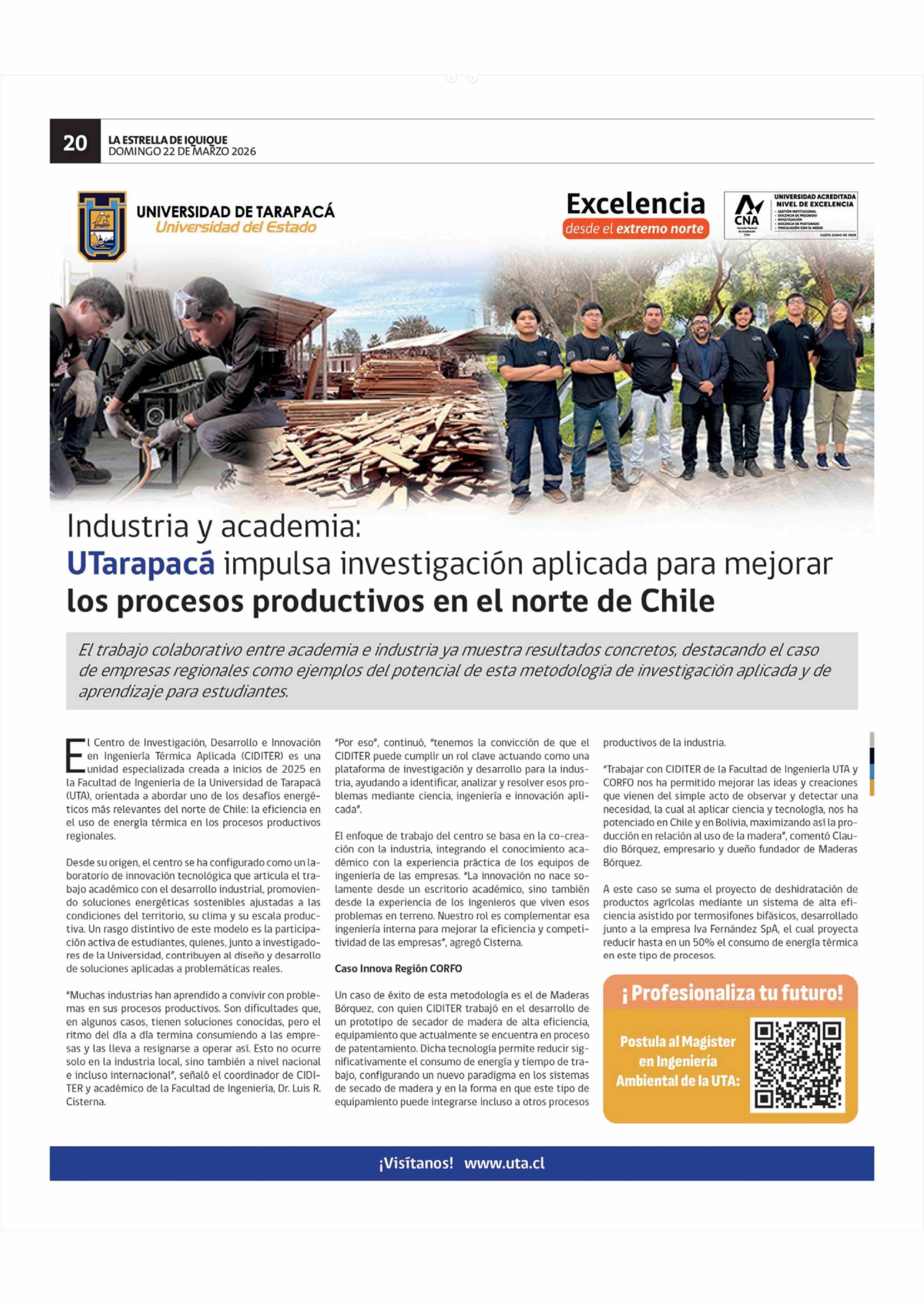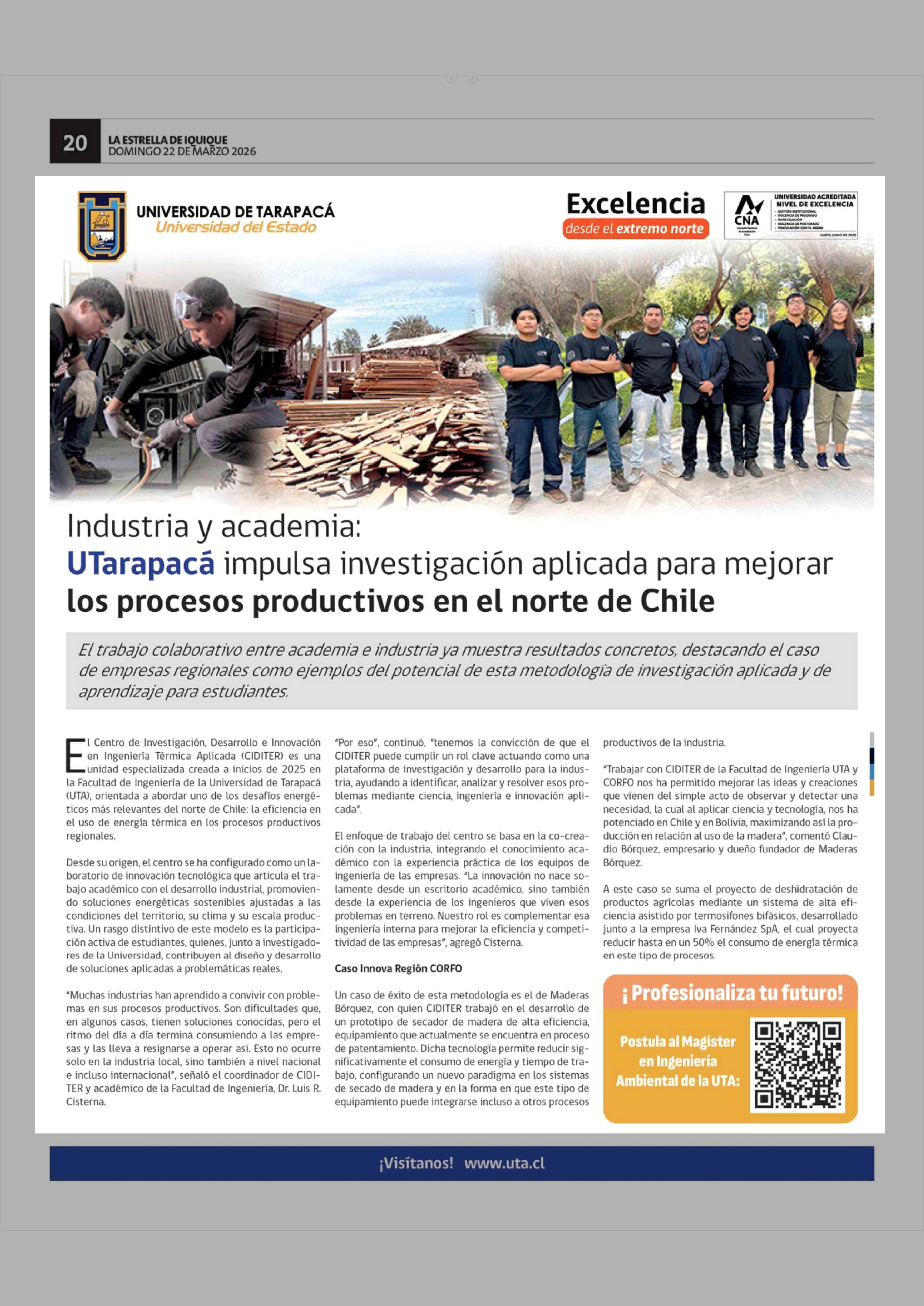 Industria y academia: UTarapacá impulsa investigación aplicada para mejorar los procesos productivos en el norte de Chile 22-03-2026 La Estrella de Iquique |