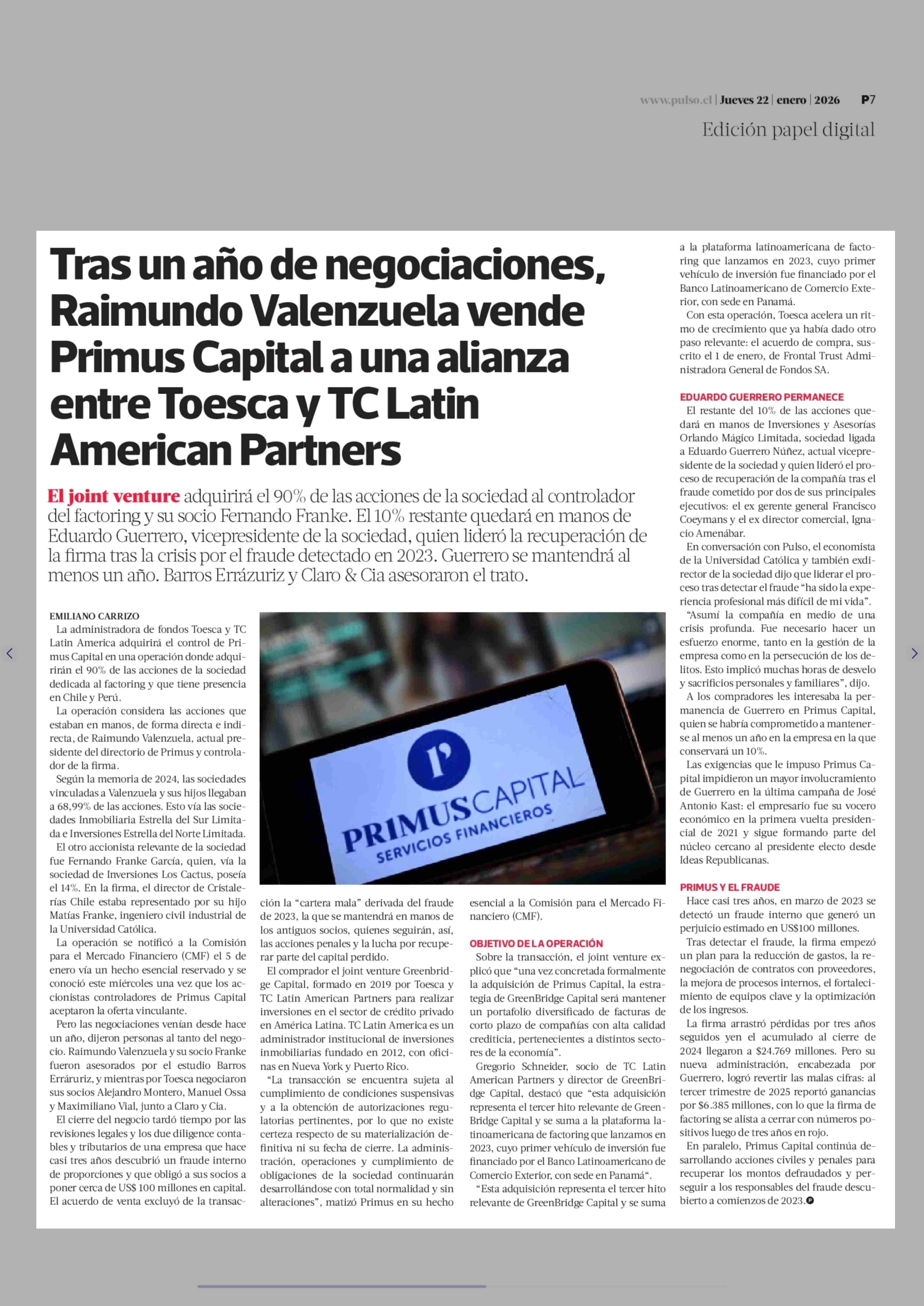 Tras un año de negociaciones, Raimundo Valenzuela vende Primus Capital a una alianza entre Toesca y TC Latin American Partners 22-01-2026 La Tercera |