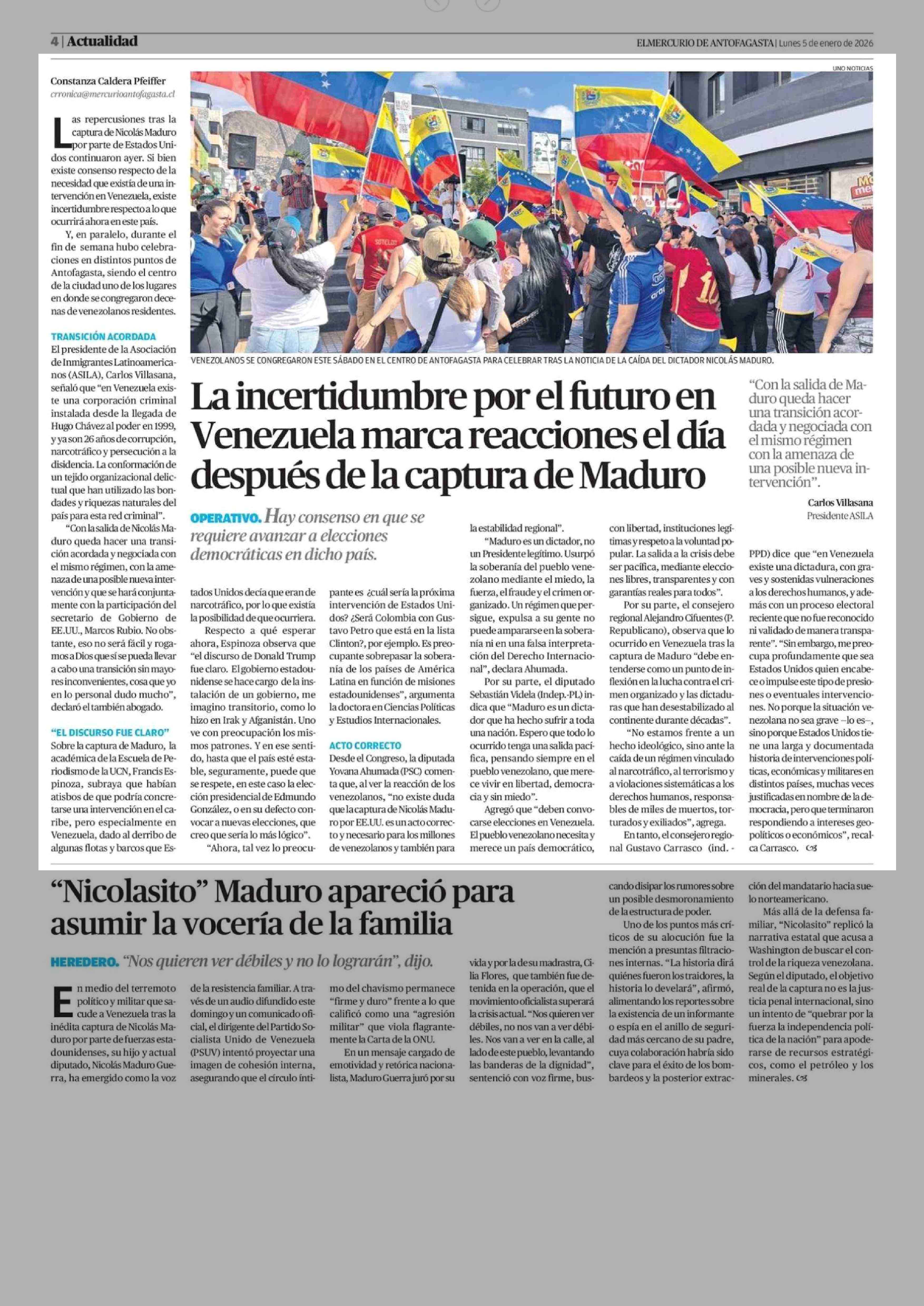 La incertidumbre por el futuro en Venezuela marca reacciones el día después de la captura de Maduro 05-01-2026 El Mercurio de Antofagasta |