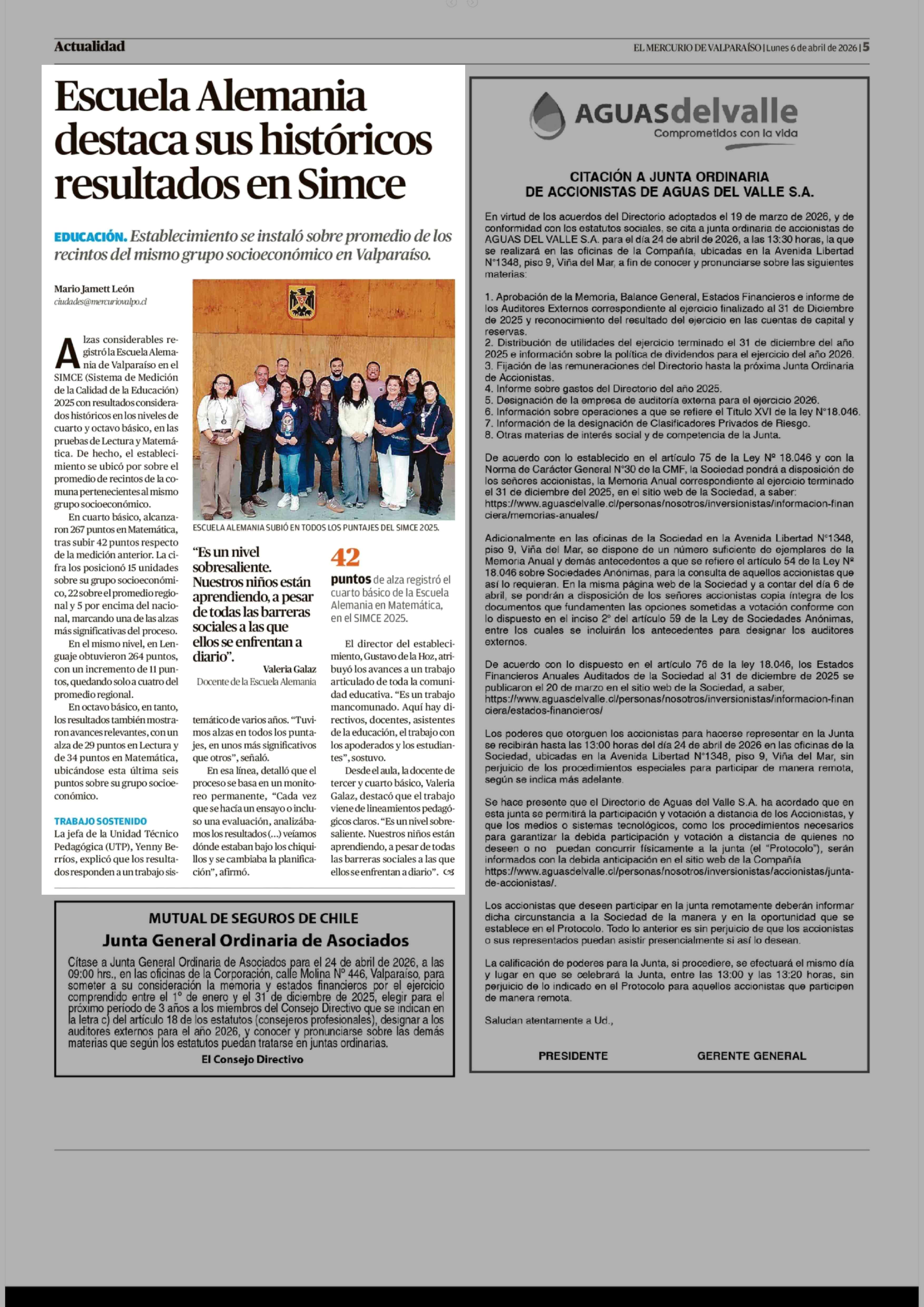 Escuela Alemania destaca sus históricos resultados en Simce 06-04-2026 El Mercurio de Valparaíso |