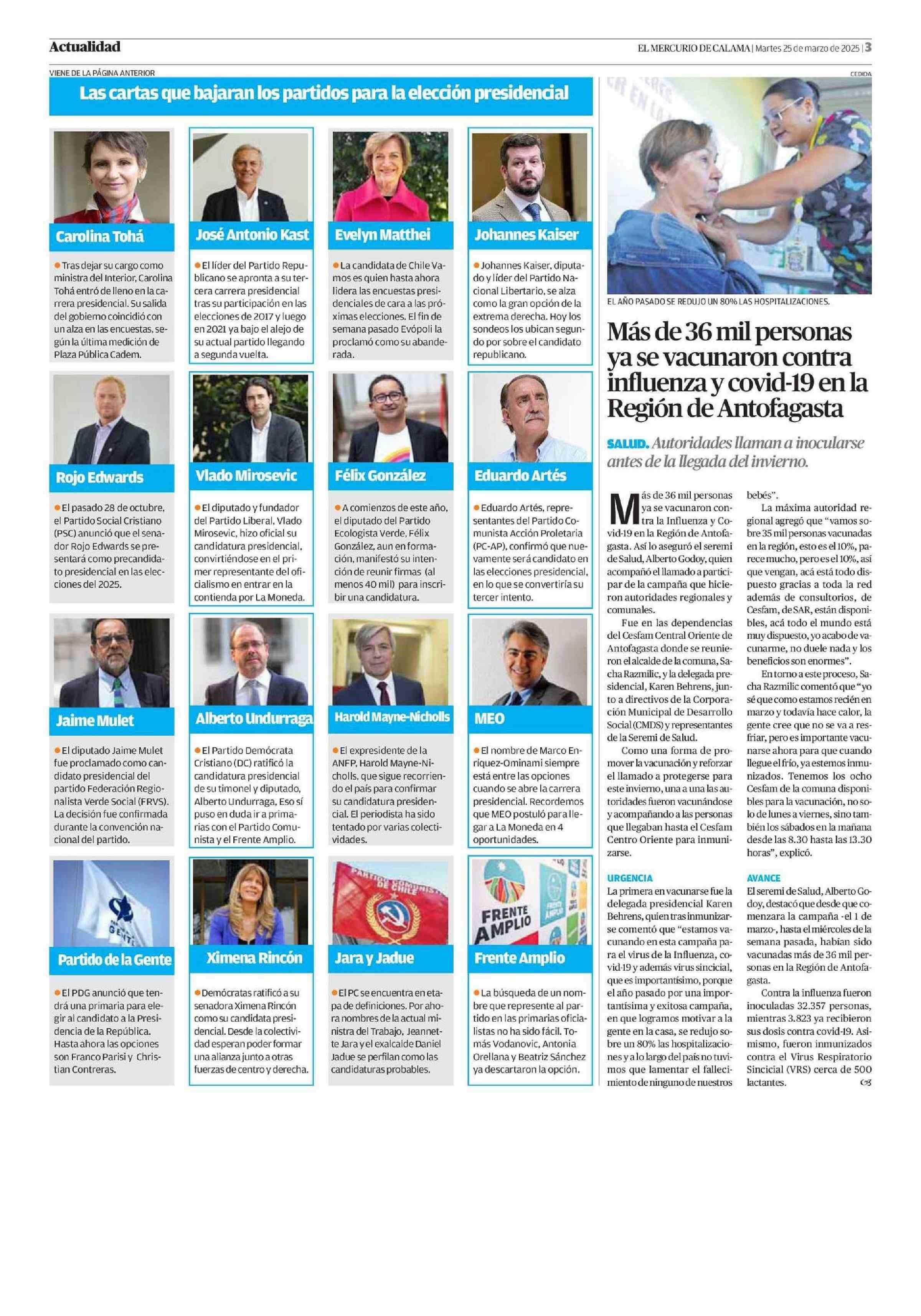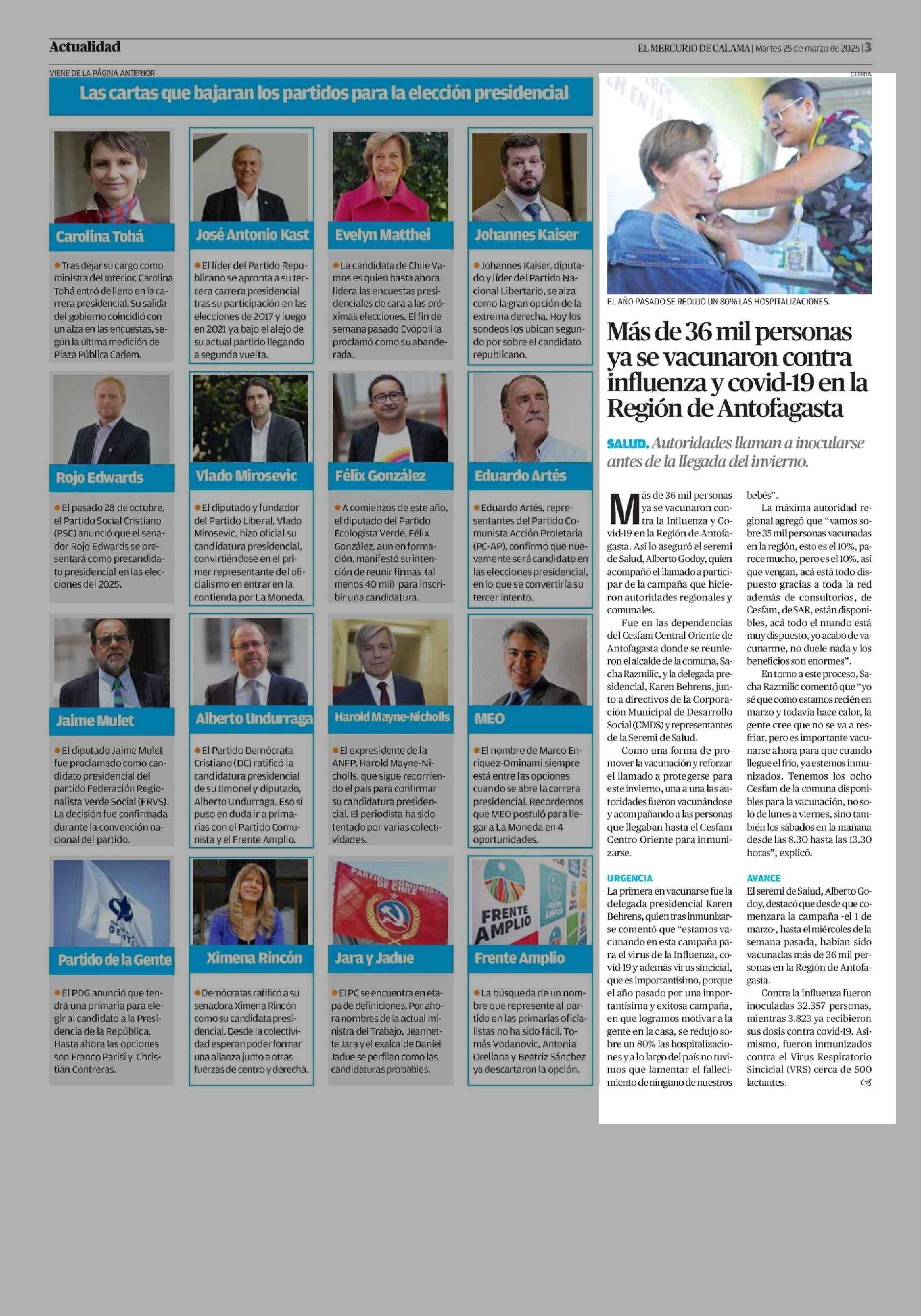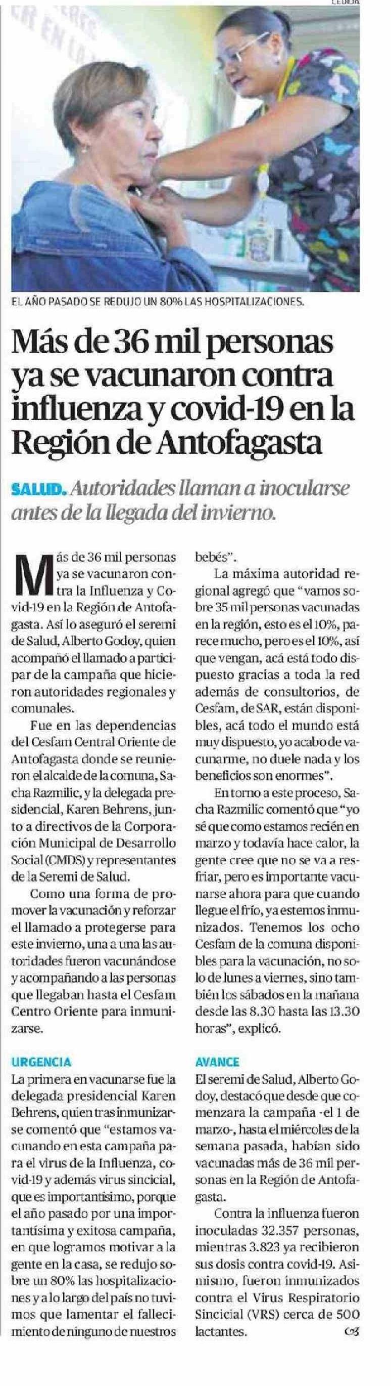 Más de 36 mil personas ya se vacunaron contra influenza y covid-19 en la Región de Antofagasta 25-03-2025 El Mercurio de Calama |