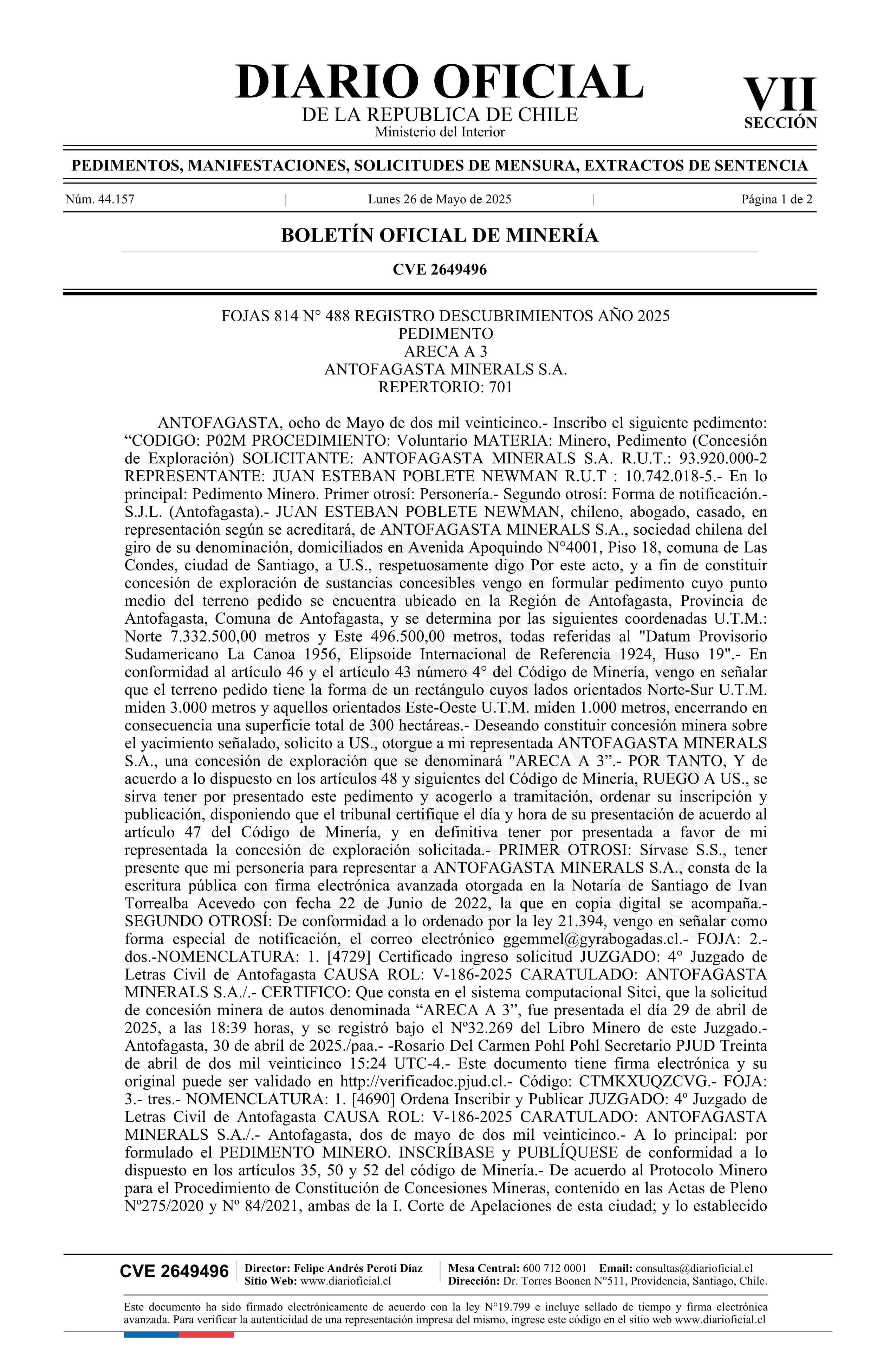 ARECA A 3 / Antofagasta Minerals S.A. 26-05-2025 DIARIO OFICIAL CHILE - BOLETÍN OFICIAL DE MINERÍA |