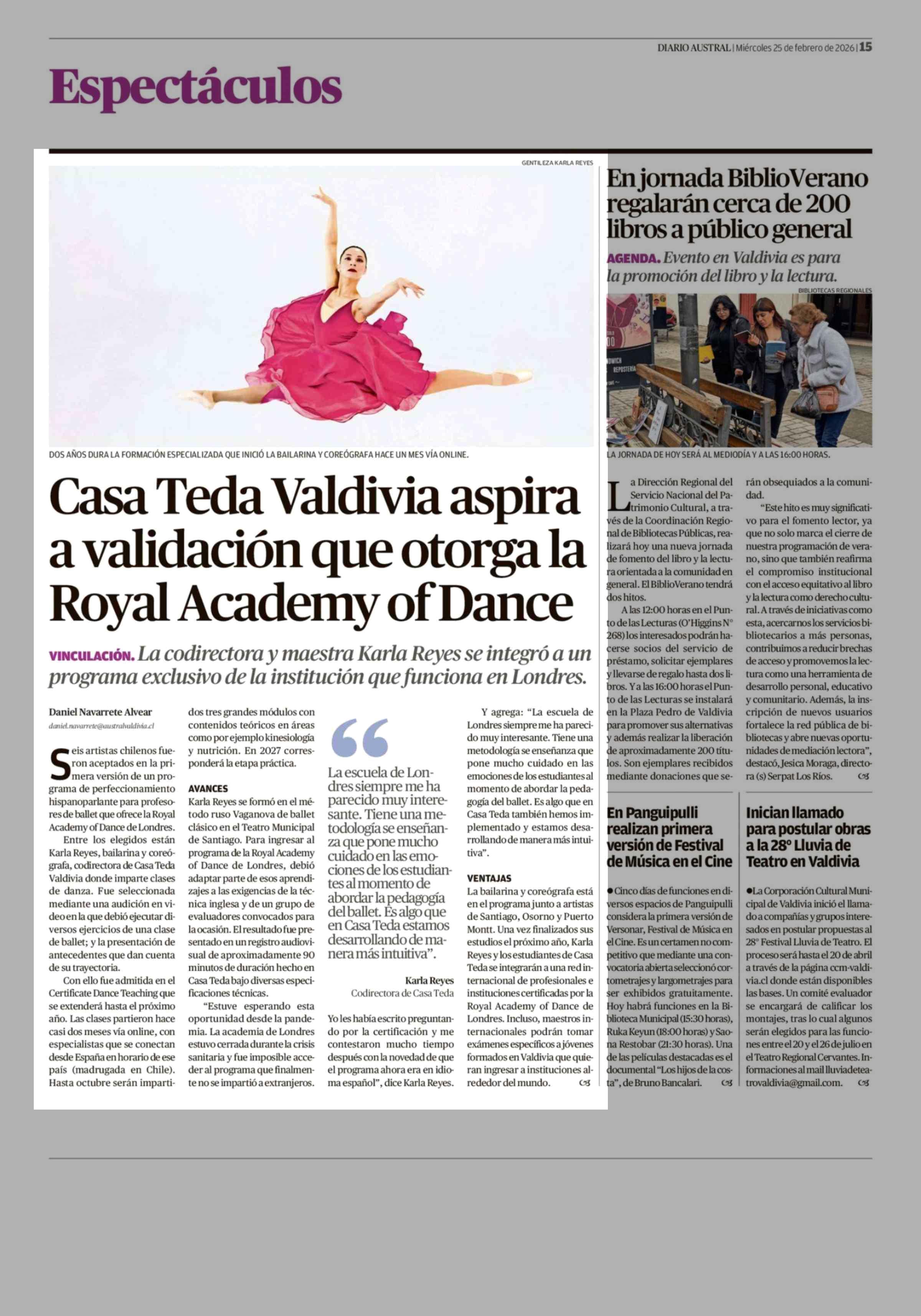 Casa Teda Valdivia aspira a validación que otorga la Royal Academy of Dance 25-02-2026 Diario Austral Región de Los Ríos |