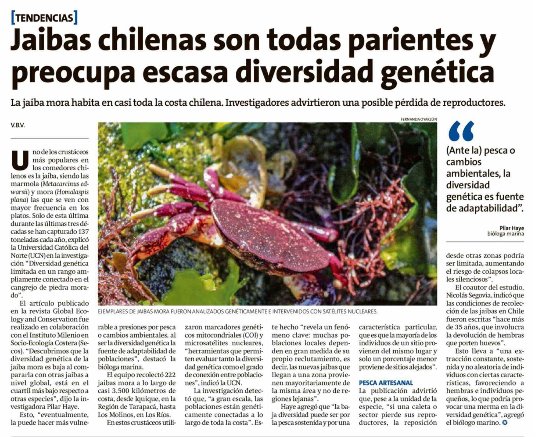 Título: Jaibas chilenas son todas parientes y preocupa escasa diversidad genética