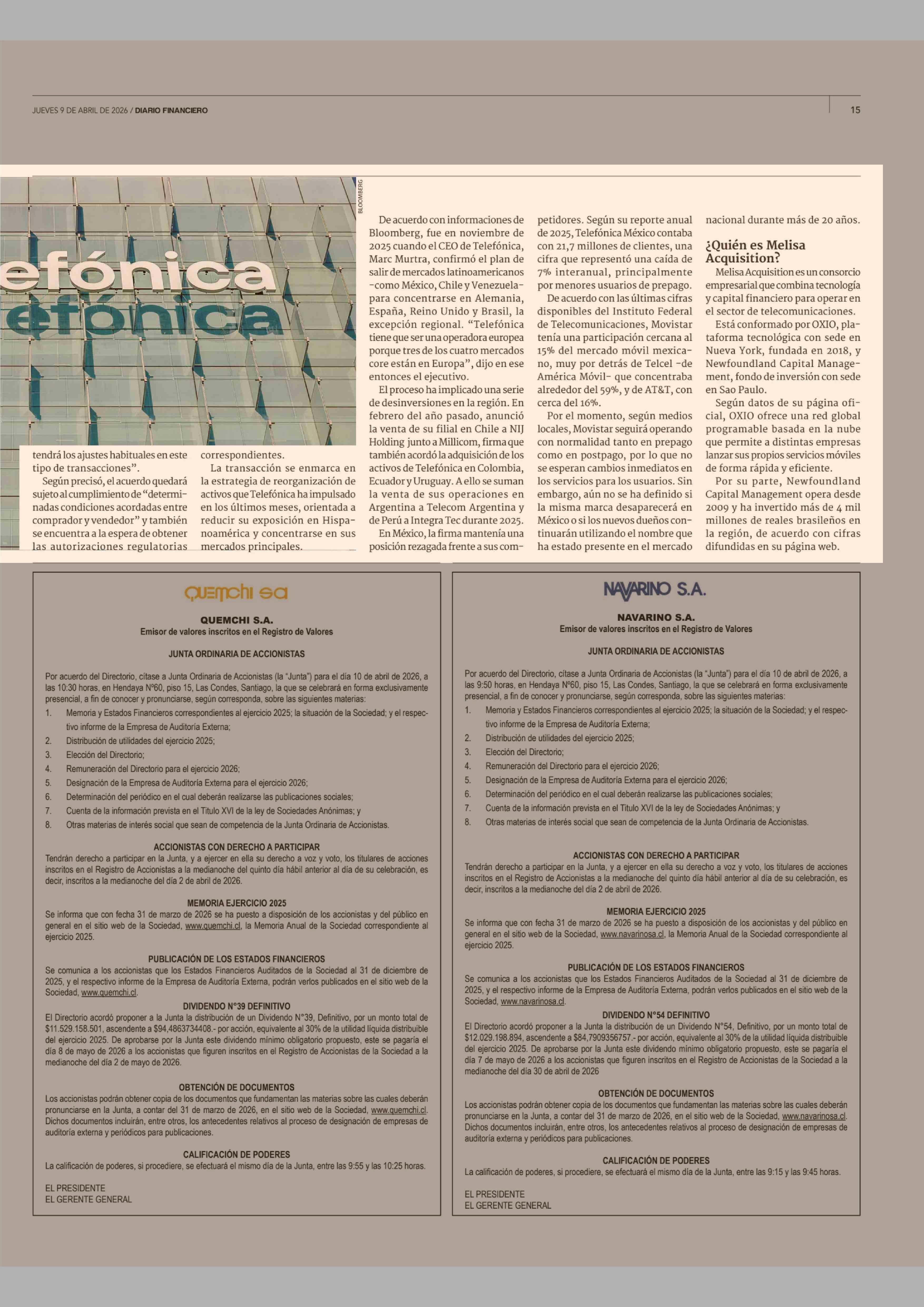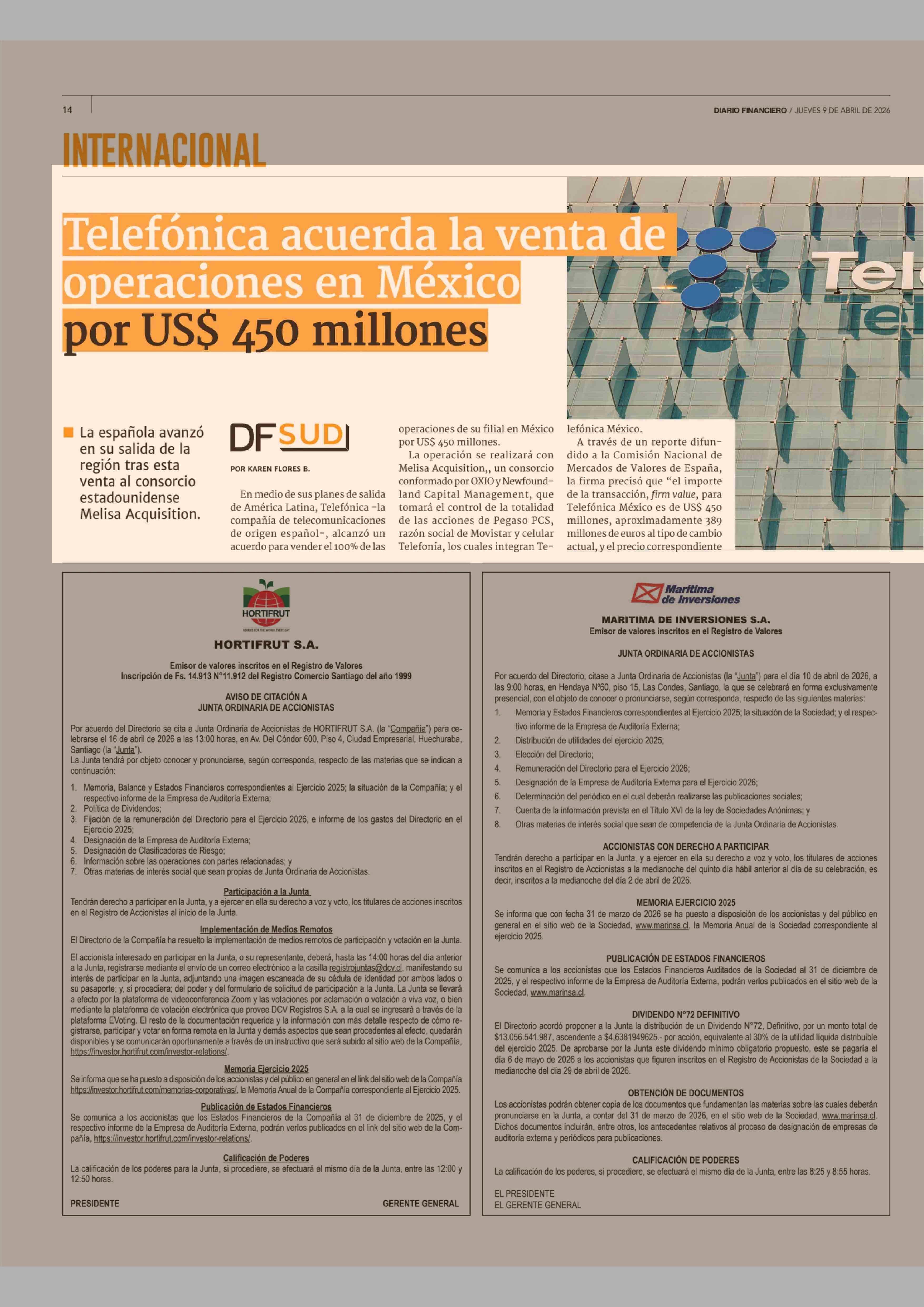 Telefónica acuerda la venta de operaciones en México por US$ 450 millones 09-04-2026 Diario Financiero |