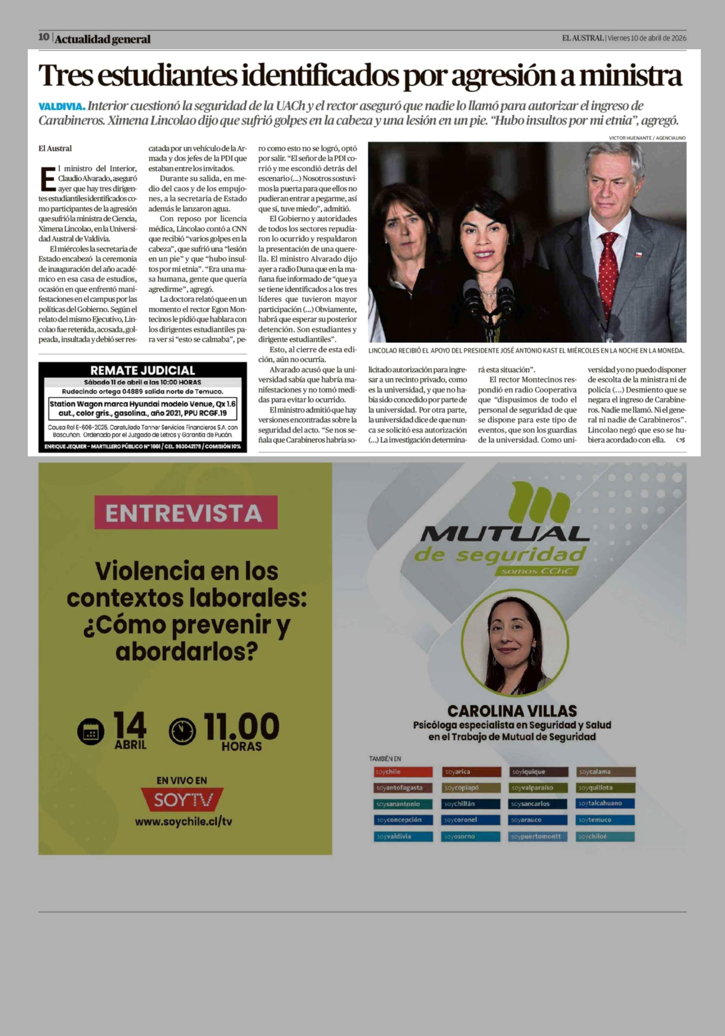 Tres estudiantes identificados por agresión a ministra 10-04-2026 El Austral de la Araucanía |