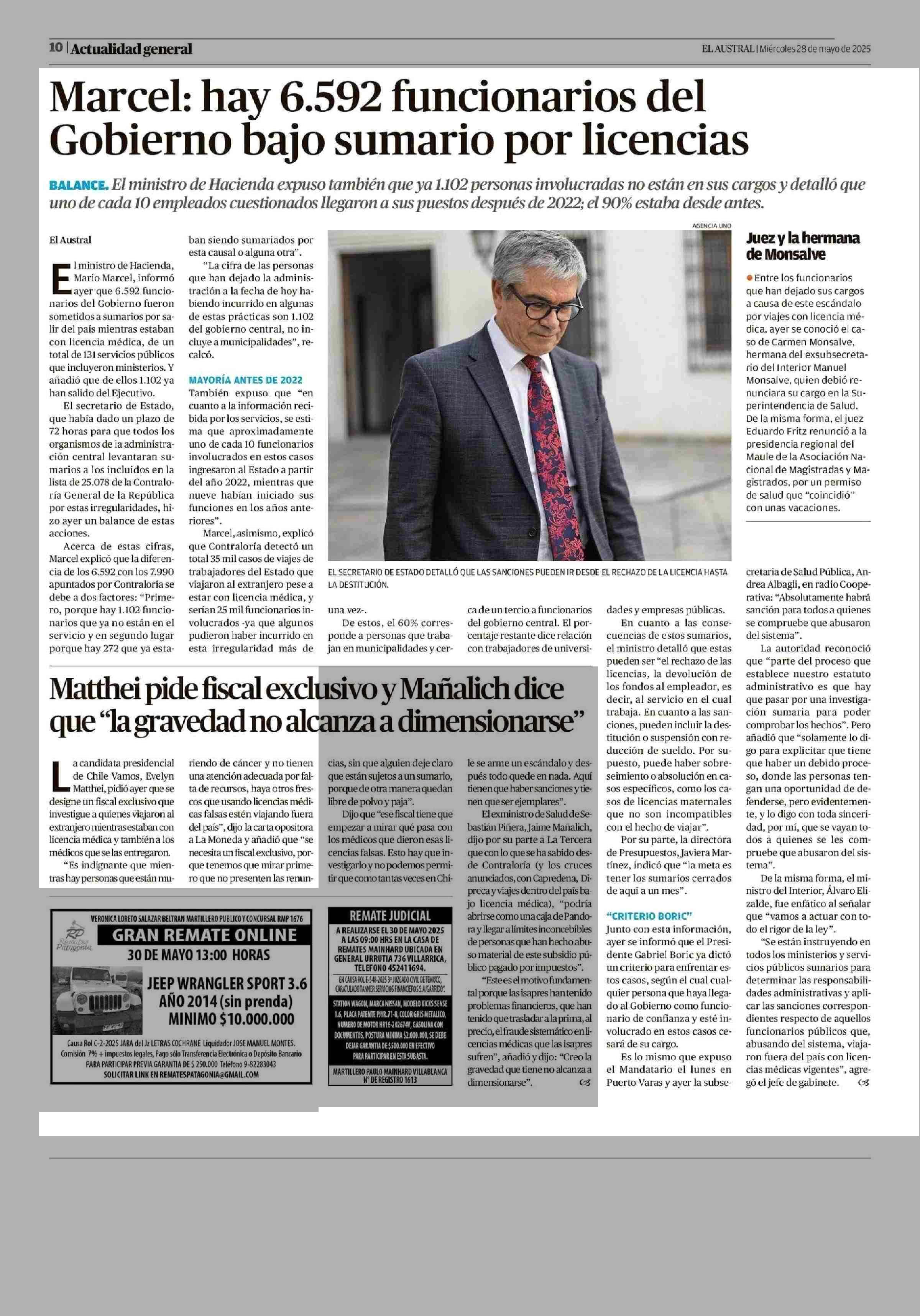 Marcel: hay 6.592 funcionarios del Gobierno bajo sumario por licencias 28-05-2025 El Austral de la Araucanía |