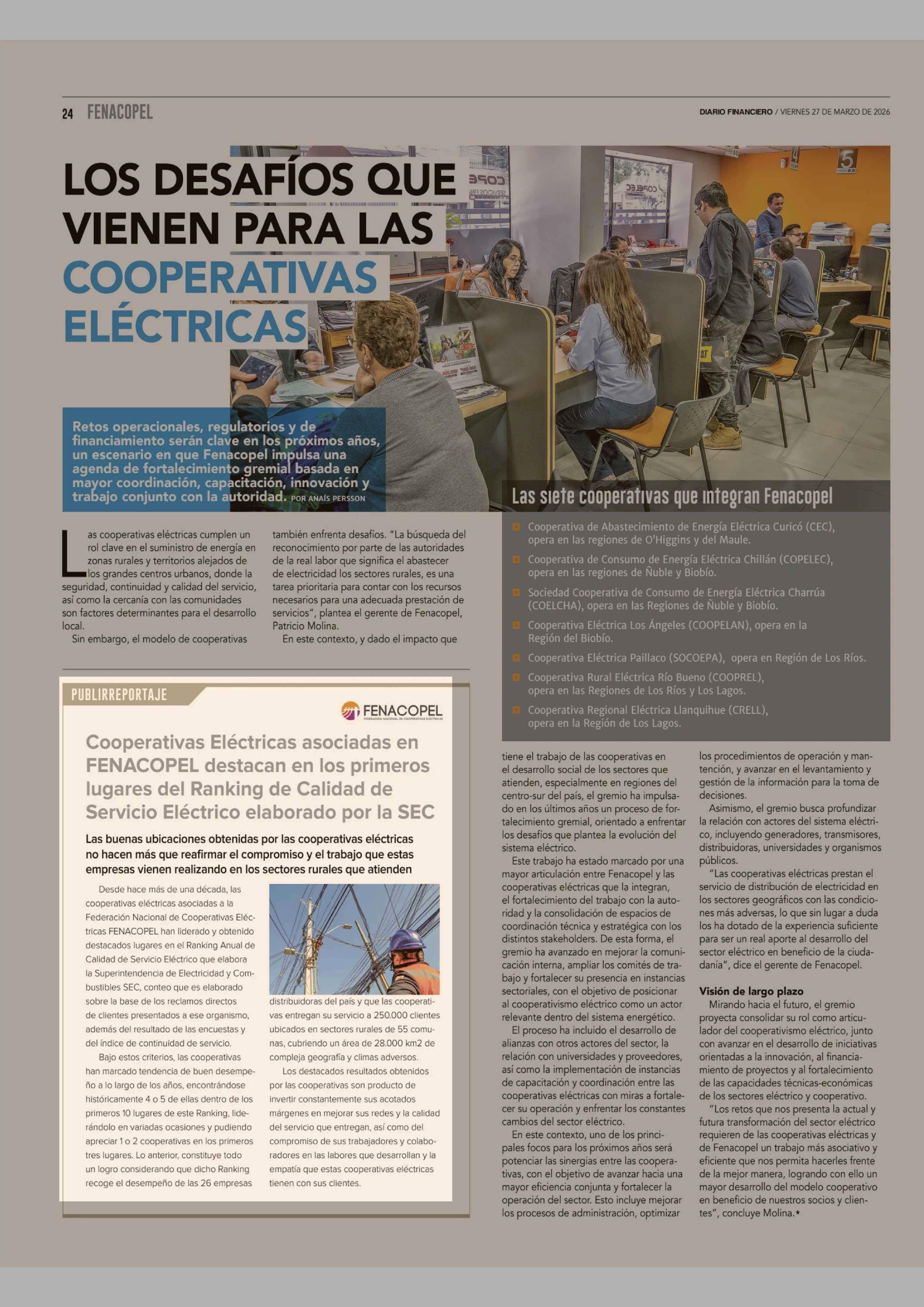 Cooperativas Eléctricas asociadas en FENACOPEL destacan en los primeros lugares del Ranking de Calidad de Servicio Eléctrico elaborado por la SEC 27-03-2026 Diario Financiero |