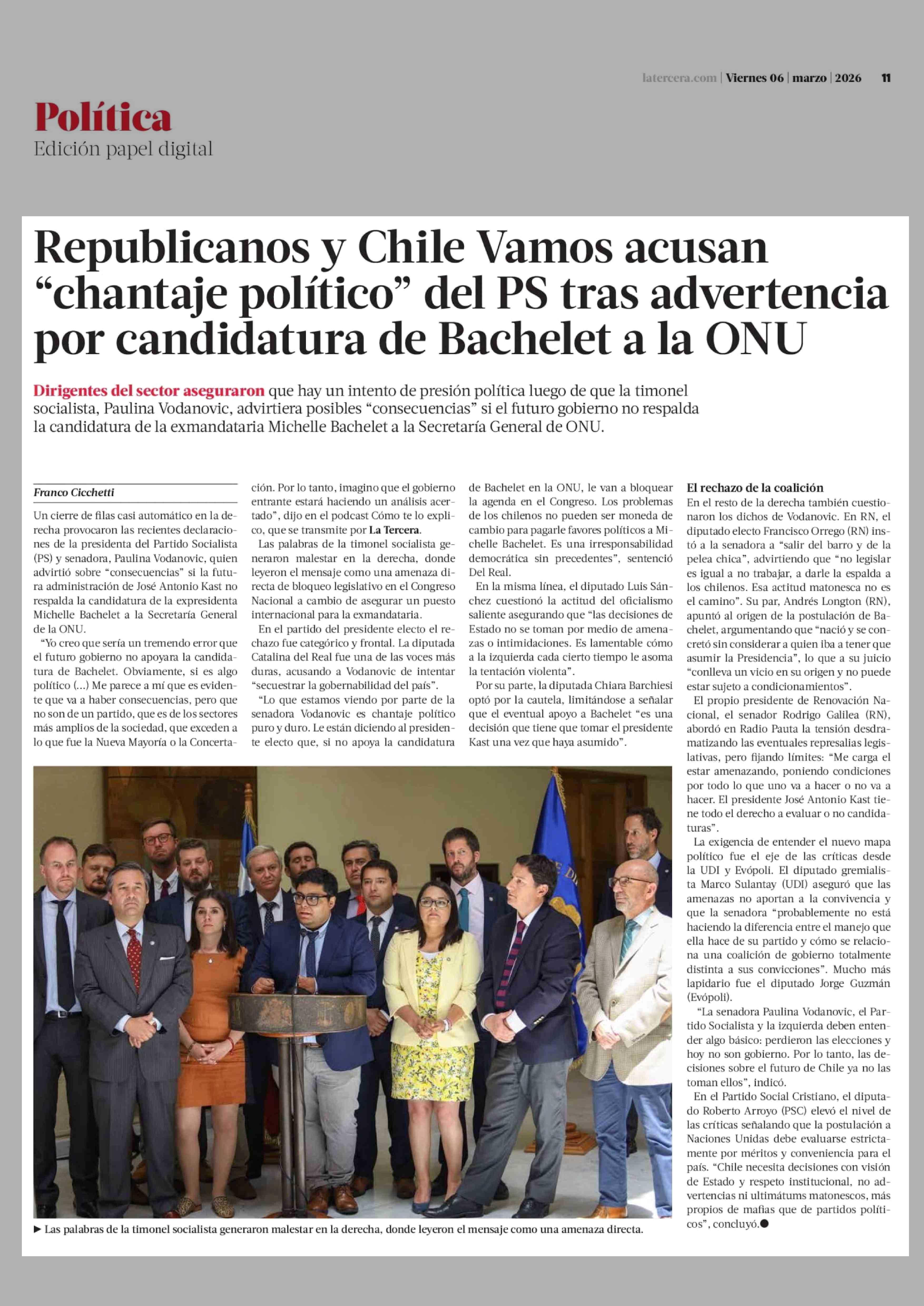 Republicanos y Chile Vamos acusan "chantaje político" del PS tras advertencia por candidatura de Bachelet a la ONU 06-03-2026 La Tercera |