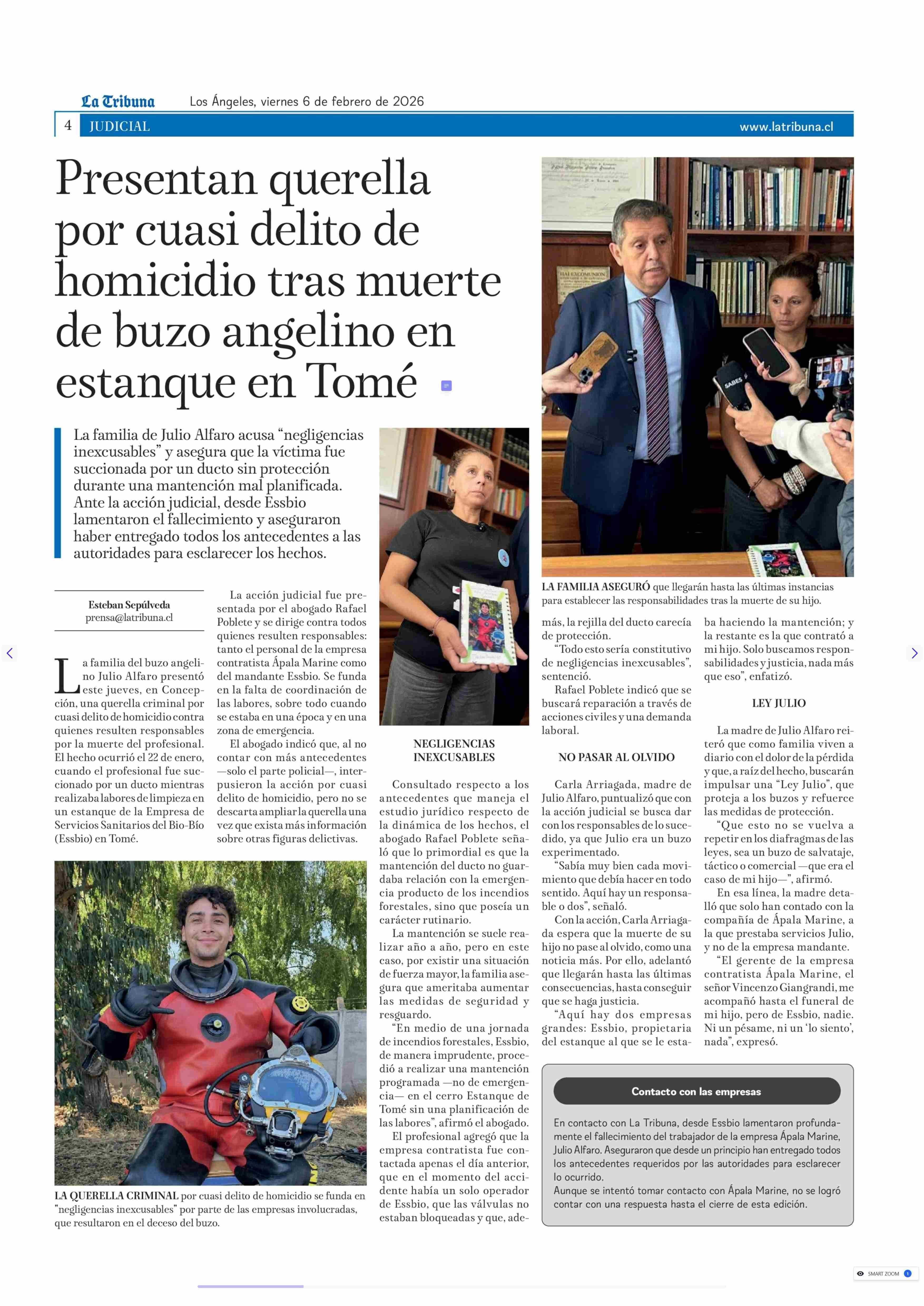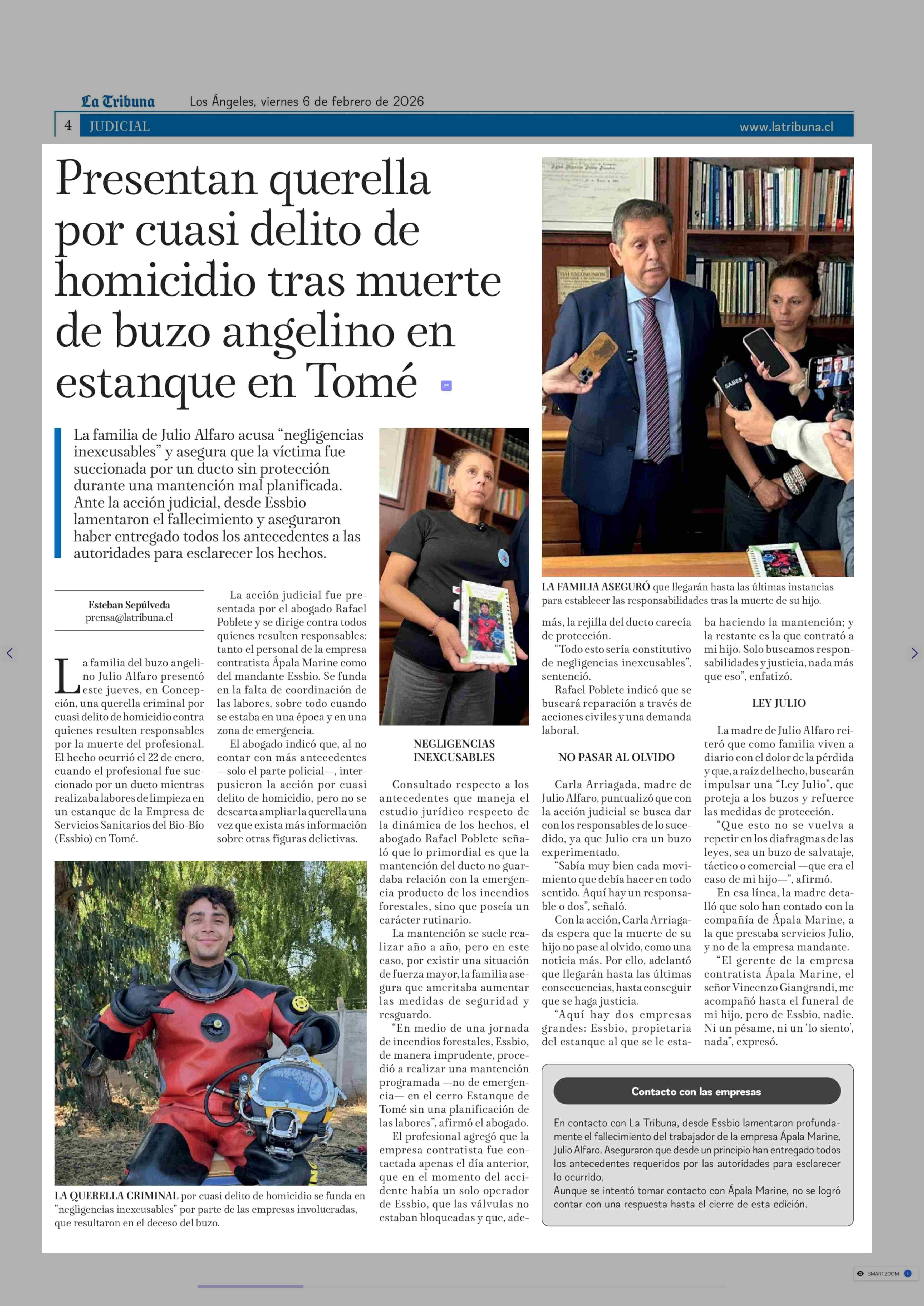 Presentan querella por cuasi delito de homicidio tras muerte de buzo angelino en estanque en Tomé 06-02-2026 La Tribuna |
