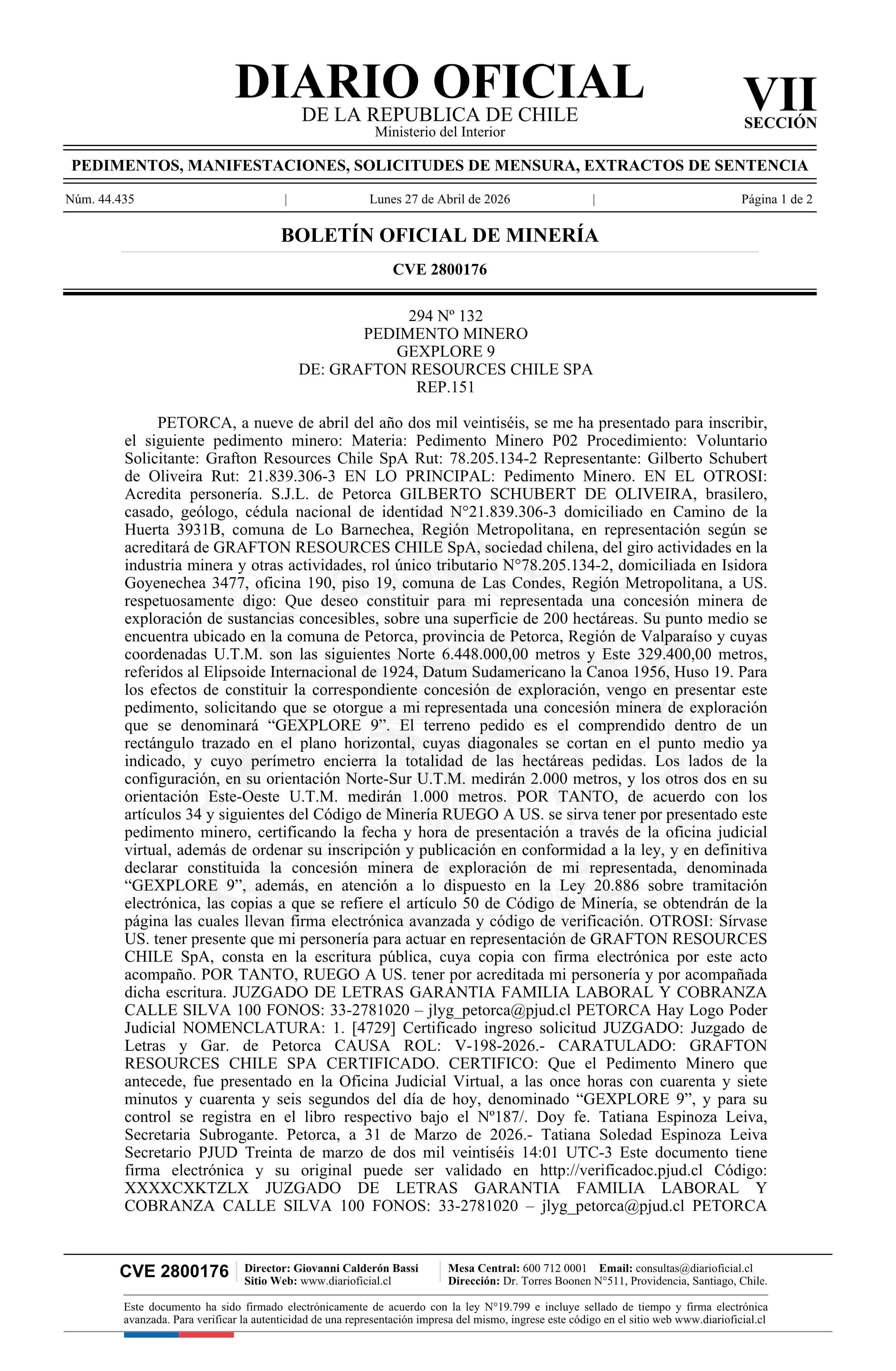 Título: GEXPLORE 9 / Grafton Resources Chile SpA