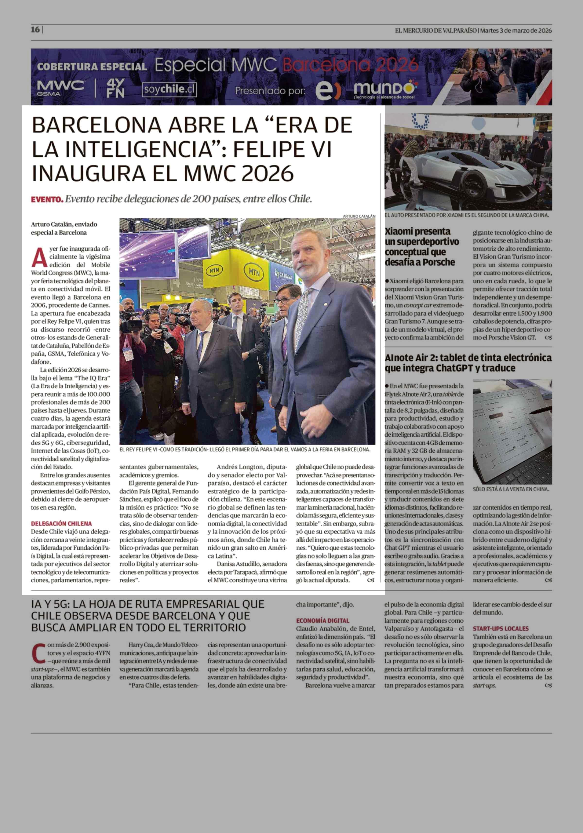 BARCELONA ABRE LA "ERA DE LA INTELIGENCIA": FELIPE VI INAUGURA EL MWC 2026 03-03-2026 El Mercurio de Valparaíso |