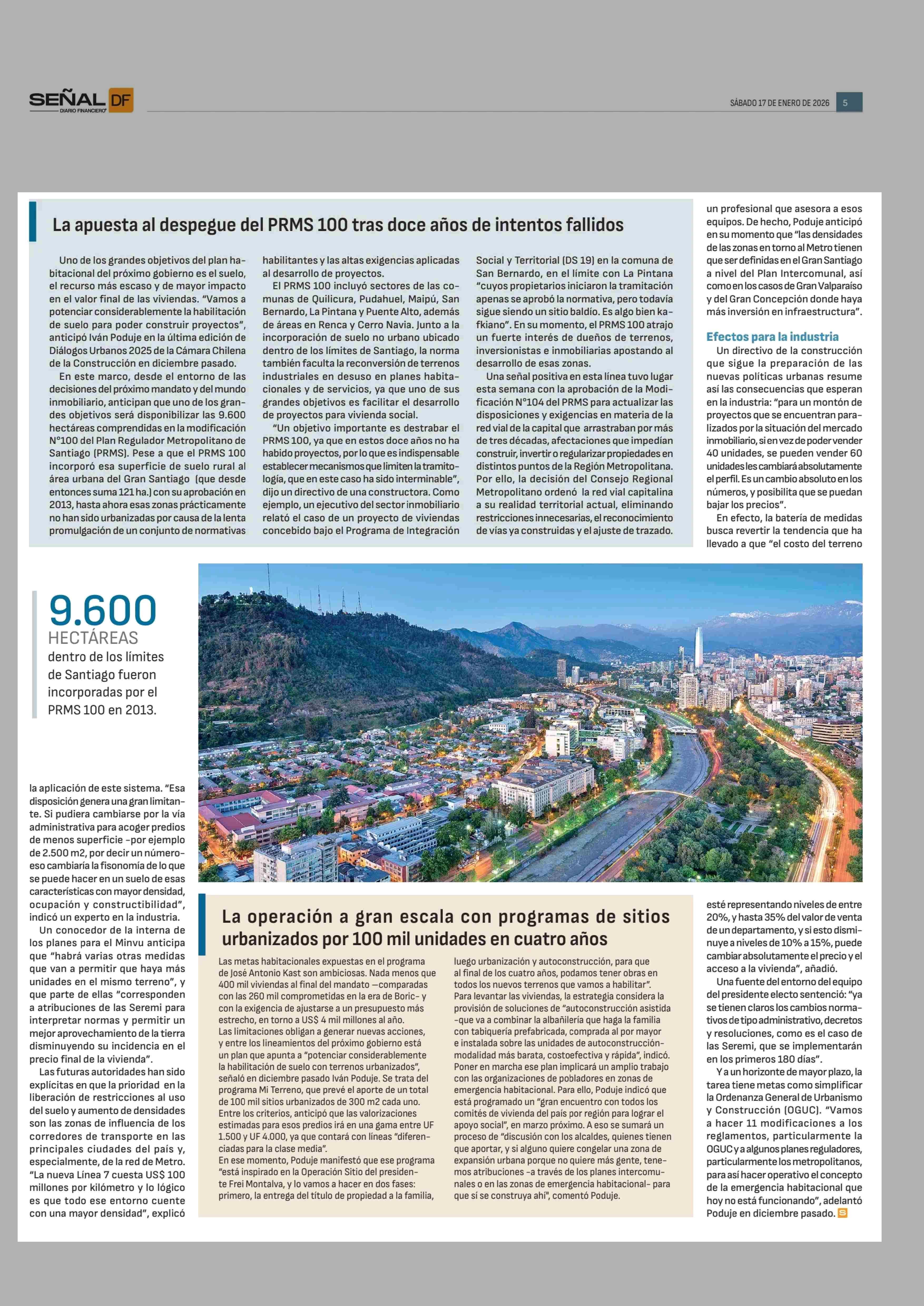 Las claves de la liberalización del suelo urbano que planea Kast y la activación de casi 10 mil hectáreas sin uso en Santiago 17-01-2026 Diario Financiero |