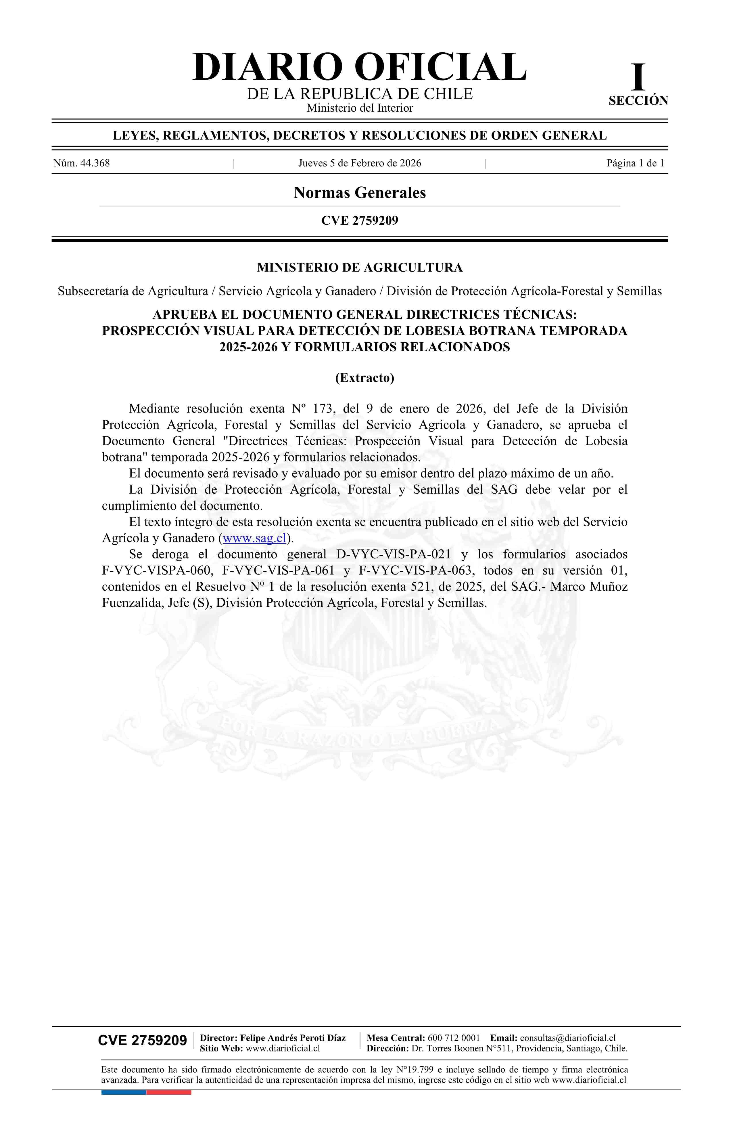 | Título: | Extracto de resolución exenta número 173, de 2026.- Aprueba el documento general directrices técnicas: Prospección visual para detección de Lobesia botrana temporada 2025-2026 y formularios relacionados |