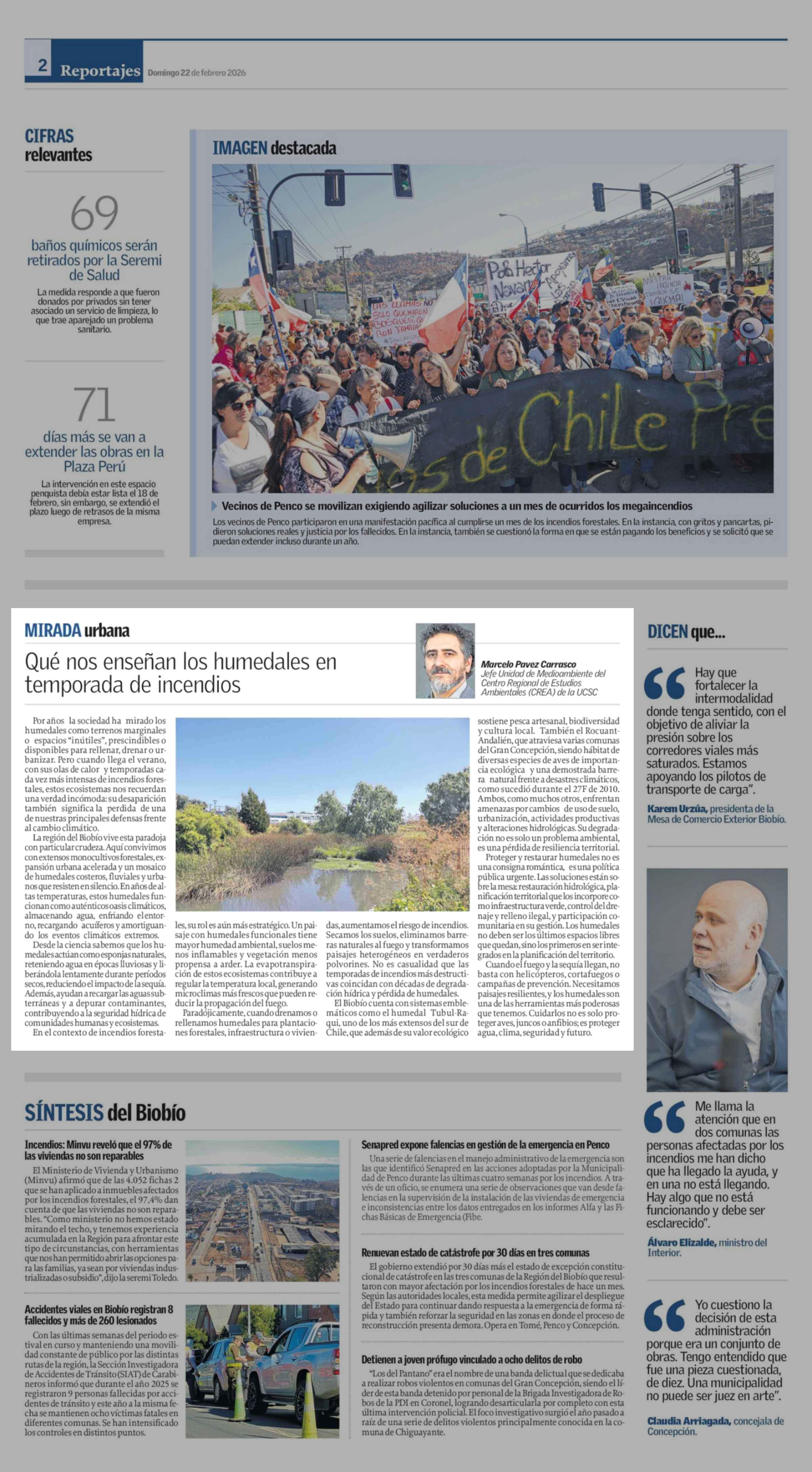 Columnas de Opinión: Qué nos enseñan los humedales en temporada de incendios 22-02-2026 El Sur |
