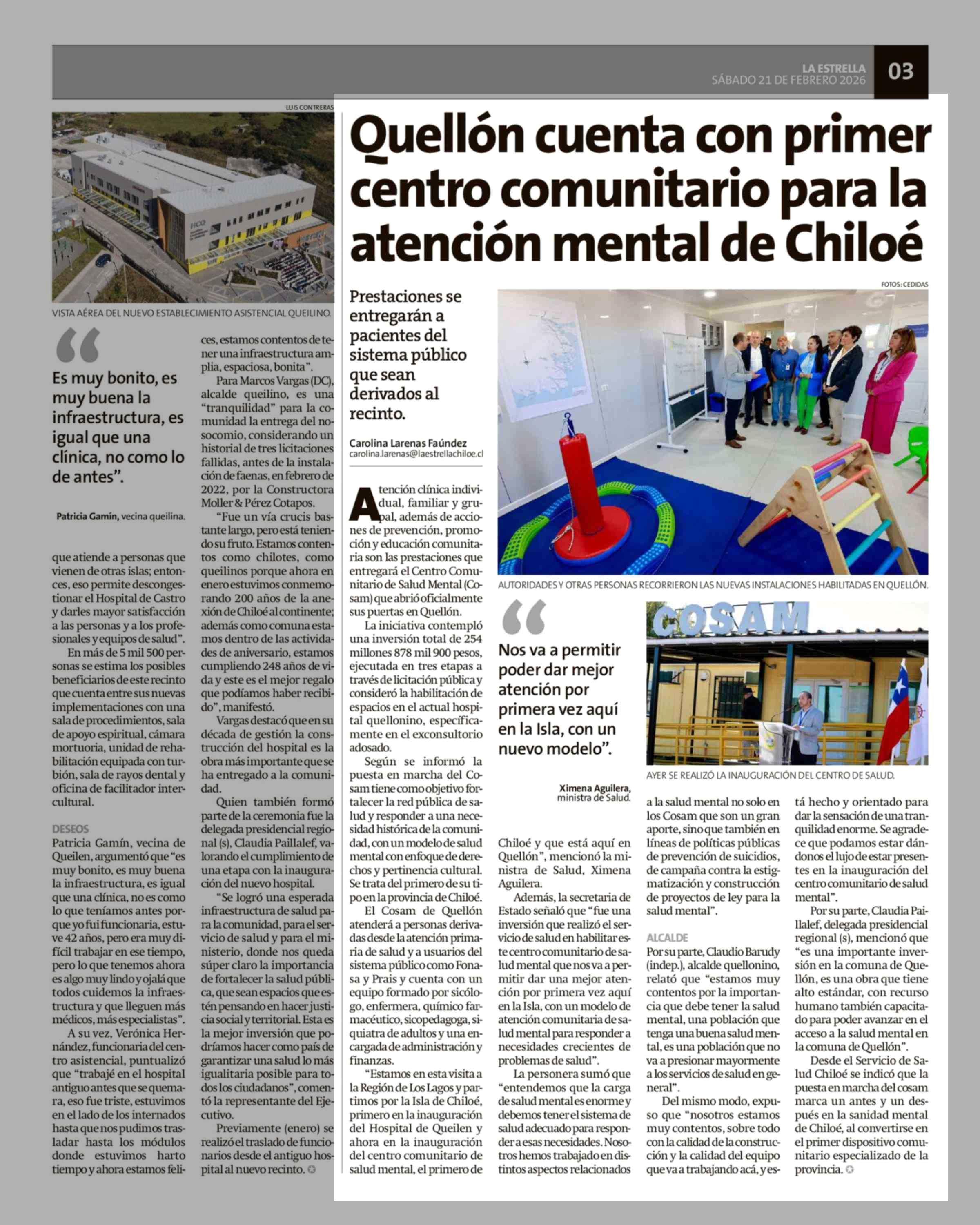 Quellón cuenta con primer centro comunitario para la atención mental de Chiloé 21-02-2026 La Estrella de Chiloé |