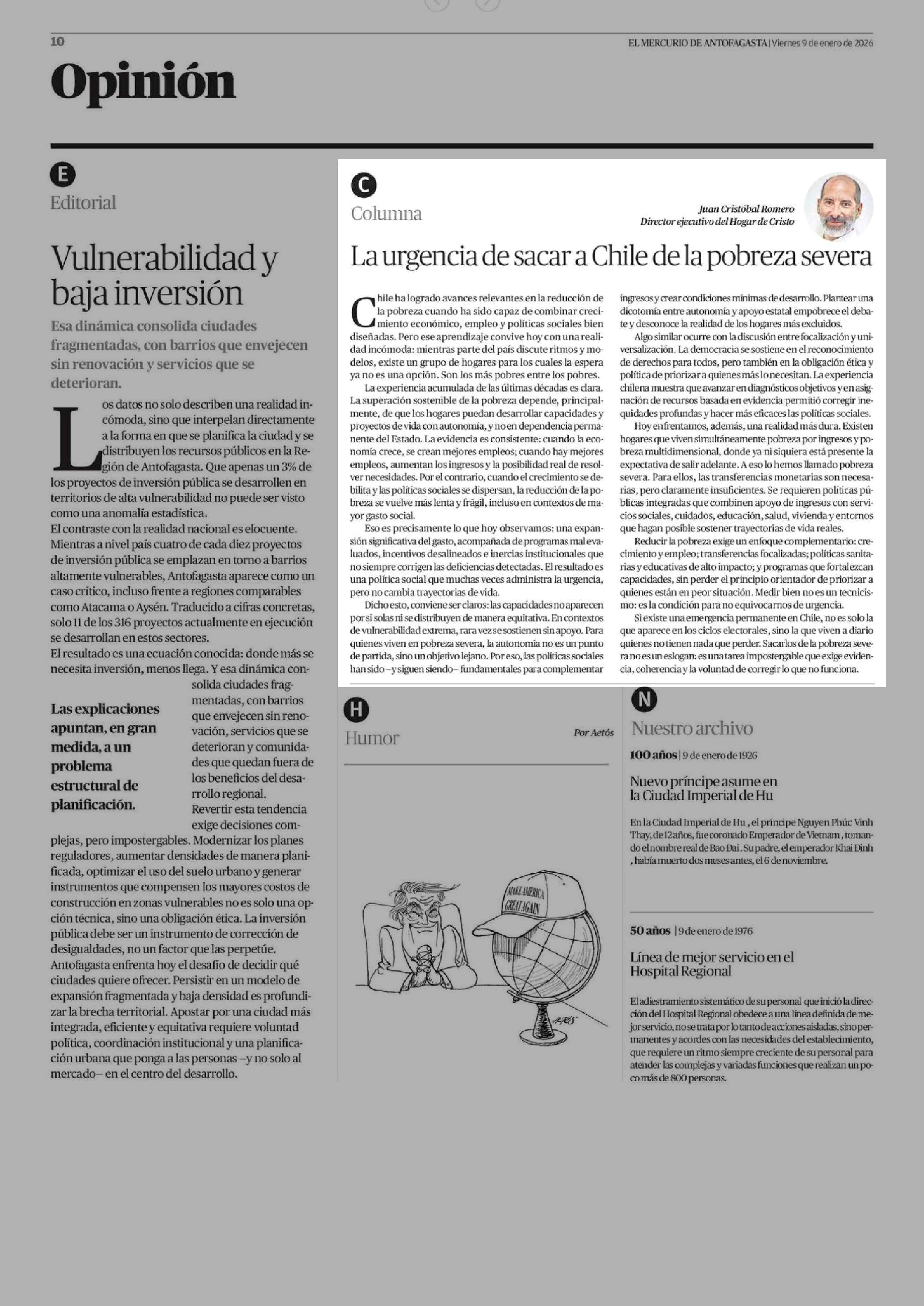 Columnas de Opinión: La urgencia de sacar a Chile de la pobreza severa 09-01-2026 El Mercurio de Antofagasta |