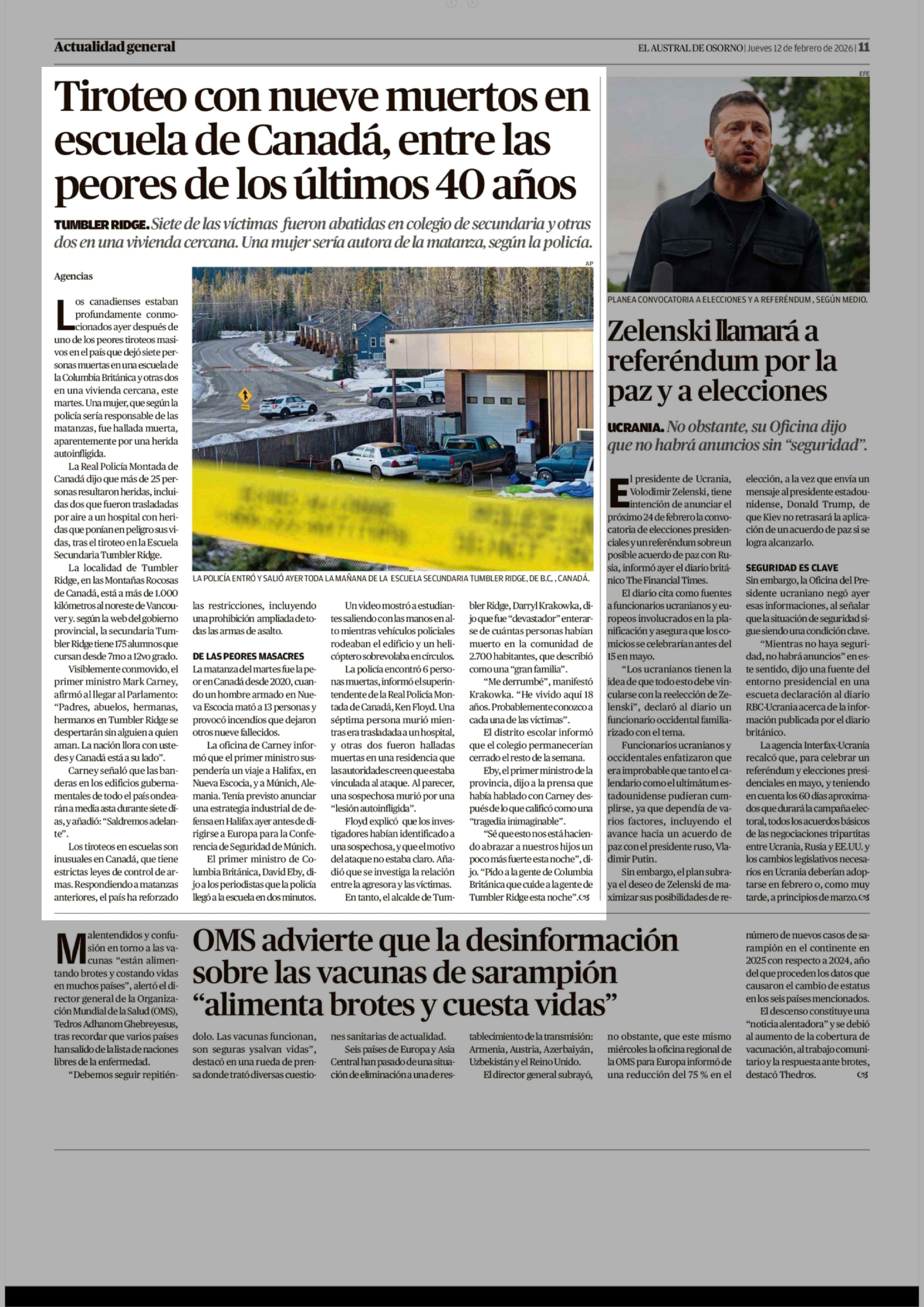 Tiroteo con nueve muertos en escuela de Canadá, entre las peores de los últimos 40 años 12-02-2026 El Austral de Osorno |